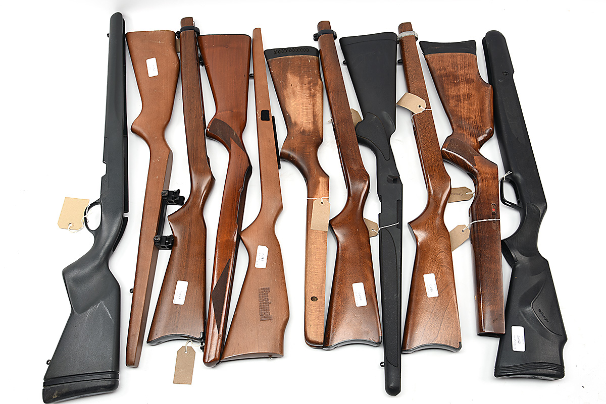 A COLLECTION OF 11 RIFLE STOCKS, comprising of 3 x Ruger 10/22, a Stoeger rifle stock, B.S.A. air rifle stock, Remington bolt-action stock, Steyr mannlicher bolt-action stock, BSA R10 air rifle stock , i x other stock, 2 x scope demo stocks