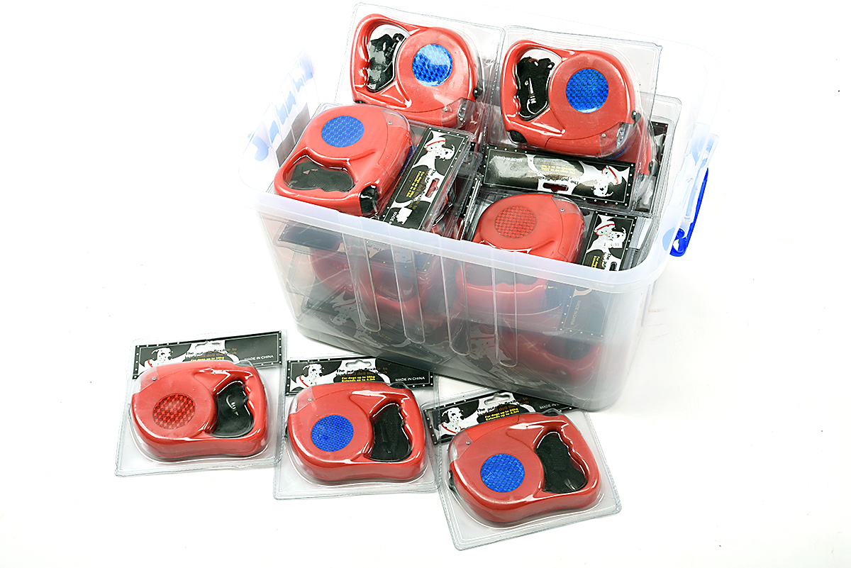 A COLLECTION OF 22 RED RETRACTABLE DOG LEADS WITH BUILT-IN TORCH