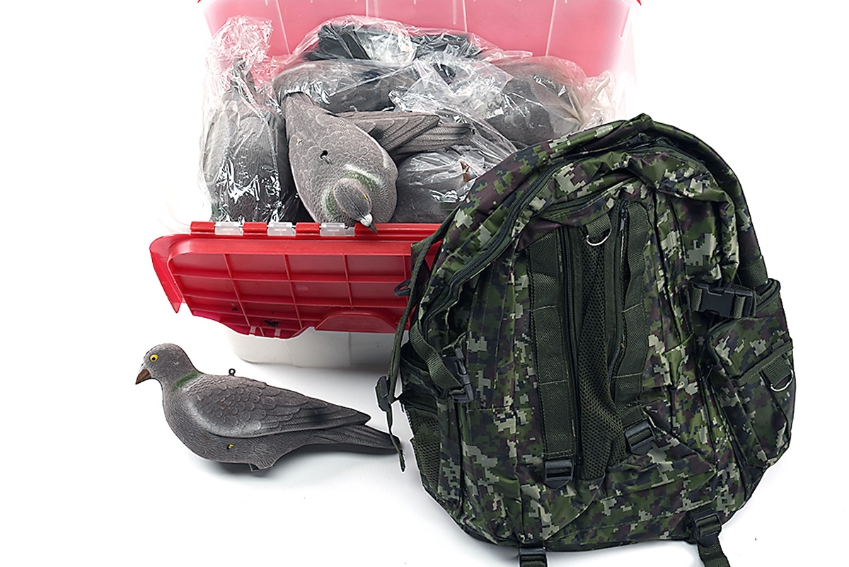 A COLLECTION OF 16 FULL BODY PIGEON DECOYS TOGETHER WITH A CAMOUFLAGE RUCKSACK