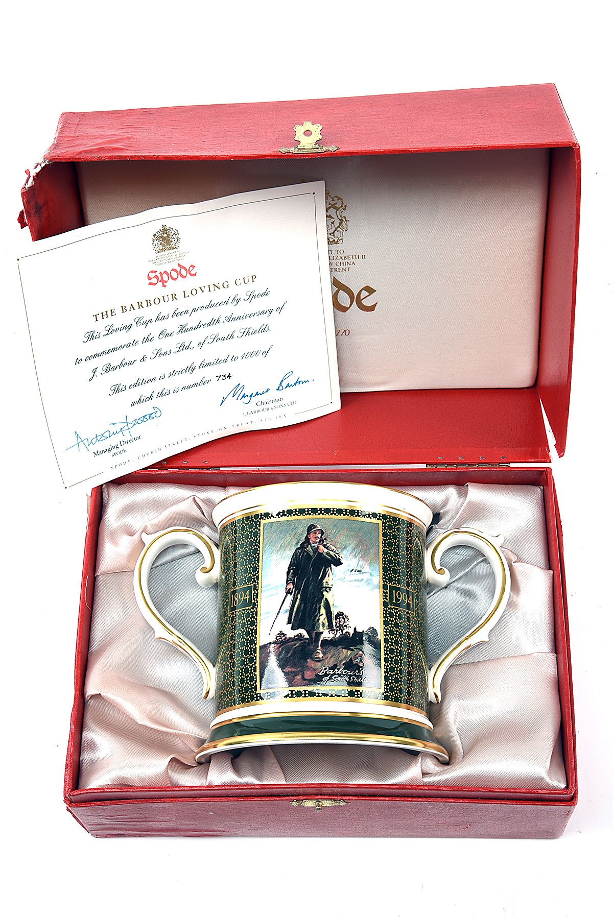 A RARE 'THE BARBOUR LOVING CUP' LIMITED EDITION CUP, no 734 of 1000, porcelain cup with 'TO CELEBRATE THE ONE HUNDRED ANNIVERSARY OF J. BARBOUR & SONS LTD. 1894- 1994', with original case with certificate