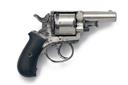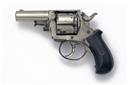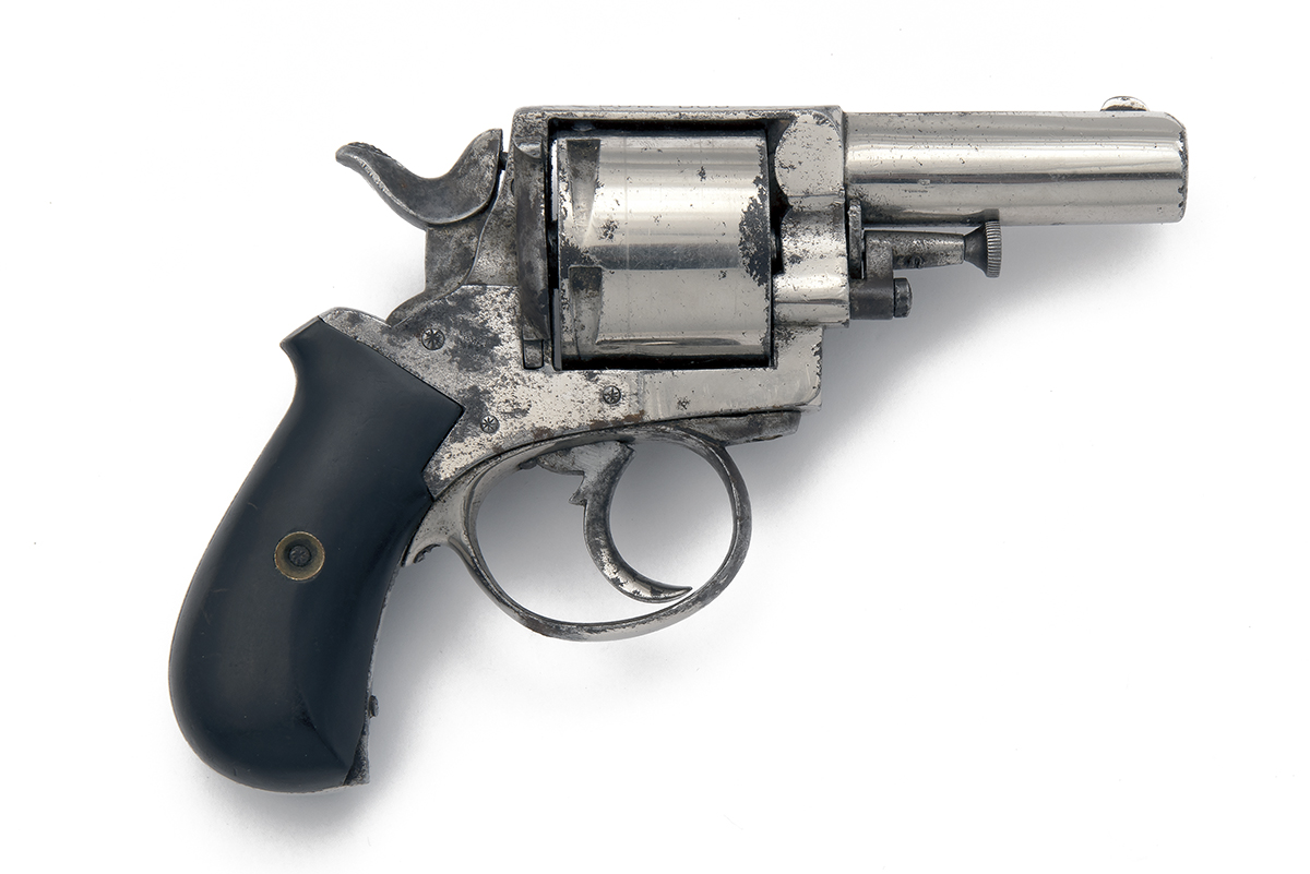 Belgian manufacture circa 1885, with plated ovoid 2 1/2in. barrel, crescent fore-sight, the top-strap with central sighting groove and marked on the flats 'THE BRITISH BULLDOG', swing out ejector, plain plated cylinder, plain plated solid frame with loading gate, double action mechanism and smooth semi birdshead ebony grips, retaining a strong amount of original plated finish, 7 1/4in. overall