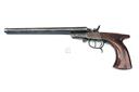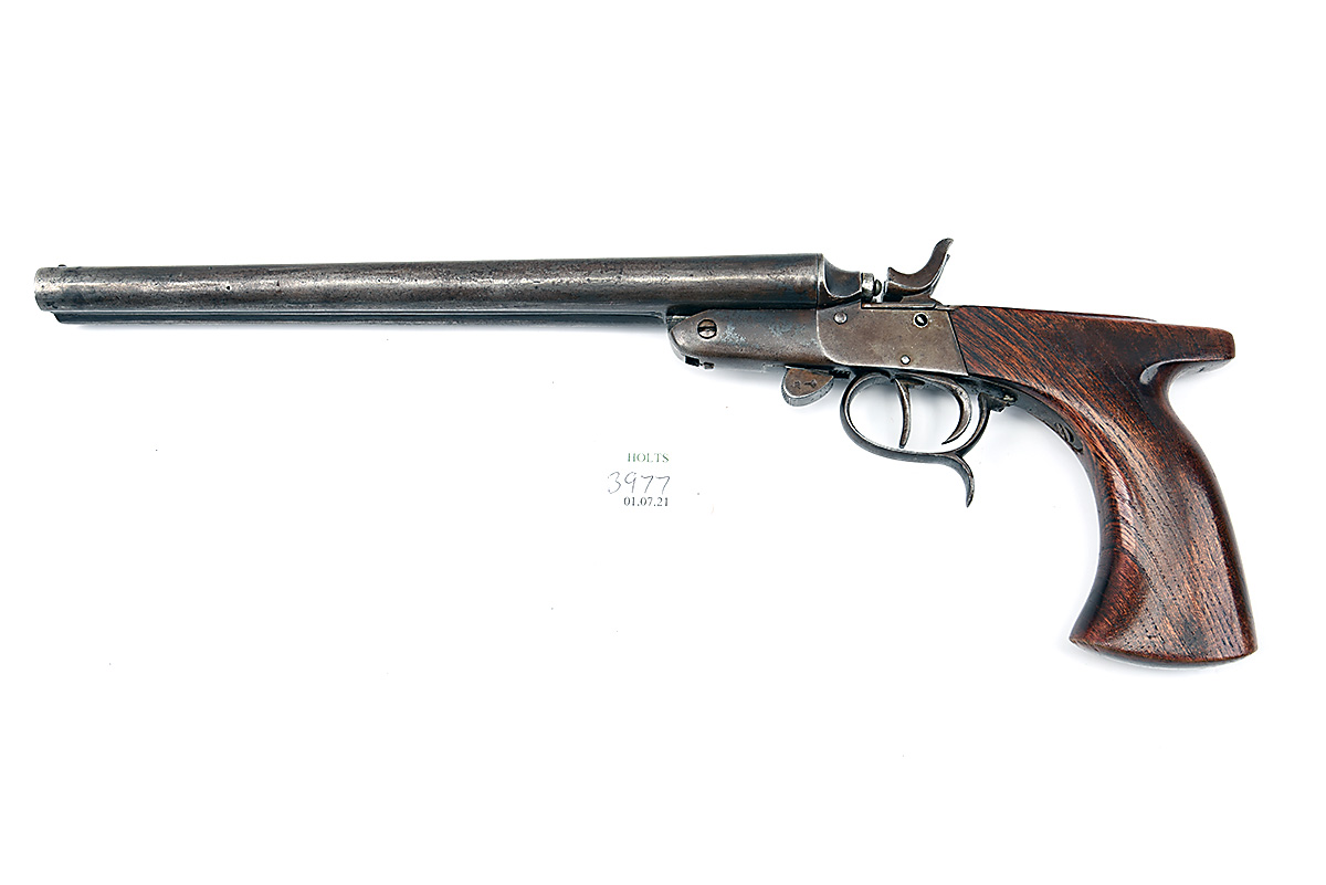 A .410 (2in.) DOUBLE-BARRELLED HAMMER SHOT-PISTOL, UNSIGNED, serial no. 22, circa 1900, with 9 5/8in. barrels, break-open action with twin central hammers, competent replacement smooth saw-handled walnut grip and spurred trigger guard, 15 1/2in. overall