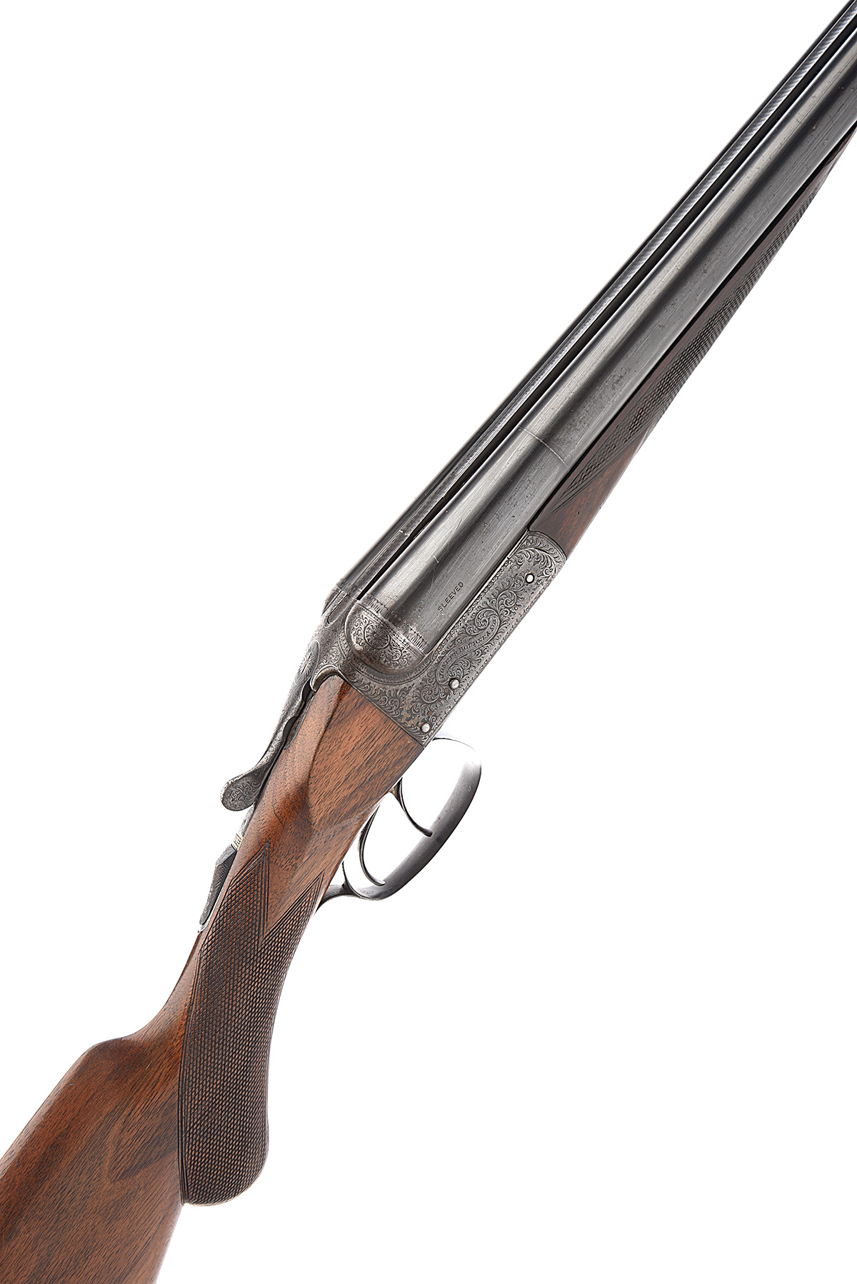 JOSEPH BOURNE & SON 12-BORE BOXLOCK EJECTOR, serial no. 22140, circa 1905, 28in. sleeved nitro barrels, the rib engraved 'JOSEPH BOURNE & SON. BIRMINGHAM.', 2 1/2in. chambers, bored approx. imp. cyl. and full choke, treble-grip action, automatic safety with gold-inlaid 'SAFE' detail, border and acanthus scroll engraving surrounding the makers name in a scrolling banner, retaining very slight traces of colour-hardening and finish, 14 1/2in. replacement semi-pistolgrip stock, fore-end with Deeley and Edge fore-end with horn finial, weight 6lb. 14oz., in a canvas slip
