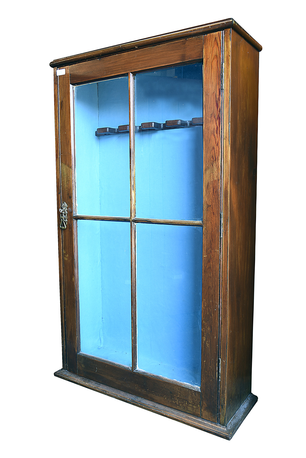 A VINTAGE GUN DISPLAY CABINET, fitted to display six full-length guns, the interior lined with blue baize, measuring approx. 52in. x 31in. x 11in.