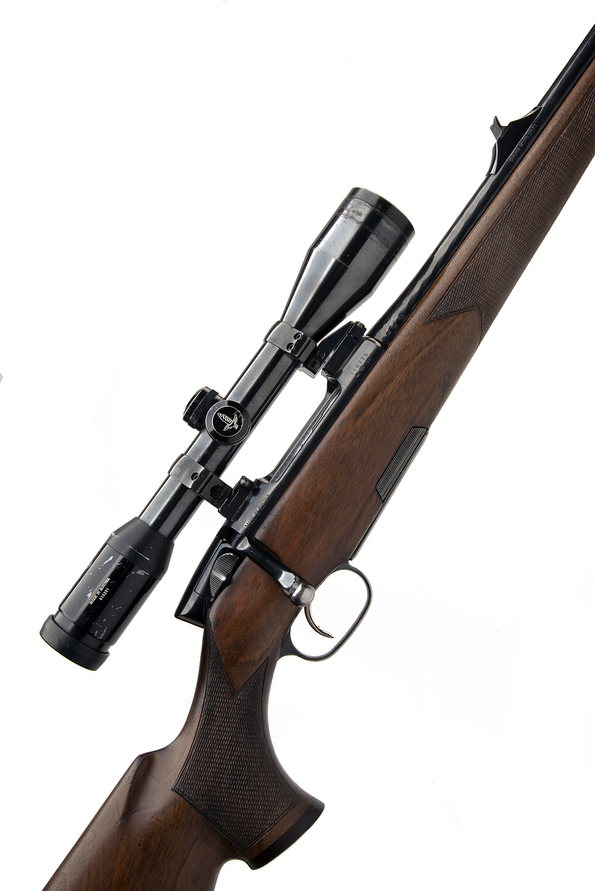 STEYR MANNLICHER .243 WIN. 'LUXUS' BOLT-MAGAZINE SPORTING RIFLE, serial no. 116775, circa 1980, 21 1/2in. fluted nitro barrel, threaded for sound moderator, fore-sight missing, v rear-sight, fitted with a Swarovski Habicht 6x42 Nova telescopic sight with quick detachable mounts, manual safety, detachable magazine, gold wash trigger, 14in. well-figured pistolgrip stock (including extension and recoil pad) with cheekpiece, sling swivels, over-all length 40 3/4in.