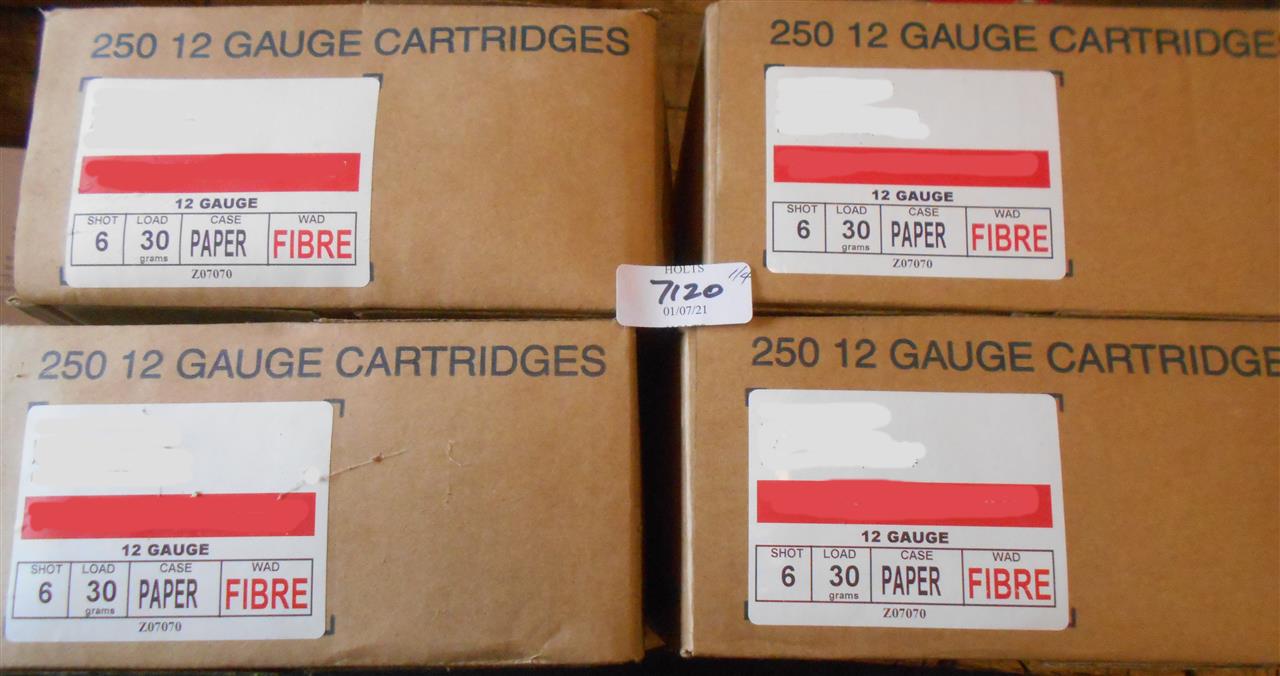 1000 12 BORE HULL PAPER CASED CRIMP CLOSURE 2 1/2in. (67mm), 30 GRAM, 6 SHOT CARTRIDGES ( 4 X SLABS)