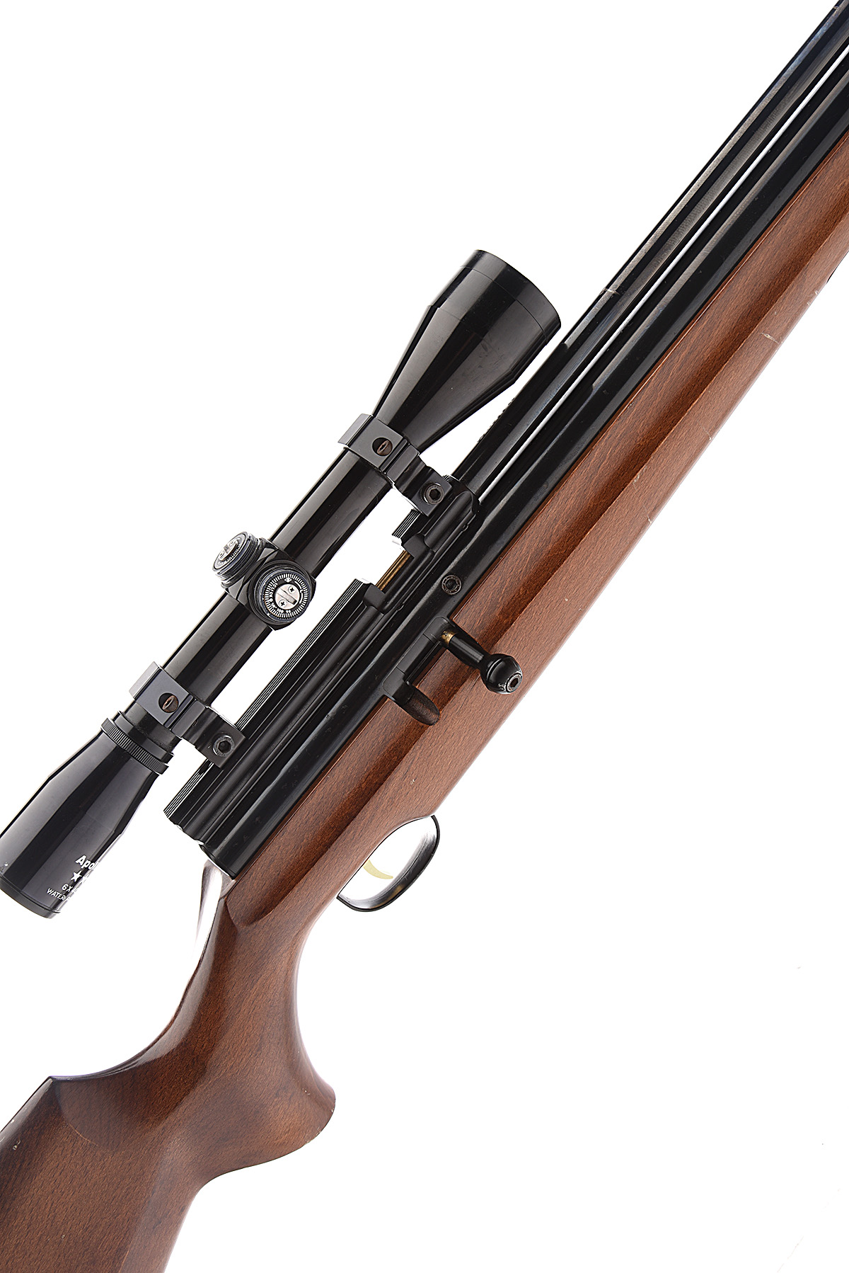 A .22 PNEUMATIC AIR-RIFLE SIGNED WEBLEY, MODEL 'RAIDER' serial no. 880843, with a 17in. barrel, blued barrel, receiver and air reservoir, with an Apollo 2 star 6x40 telescopic sight and silencer fitted in a beech half stock.