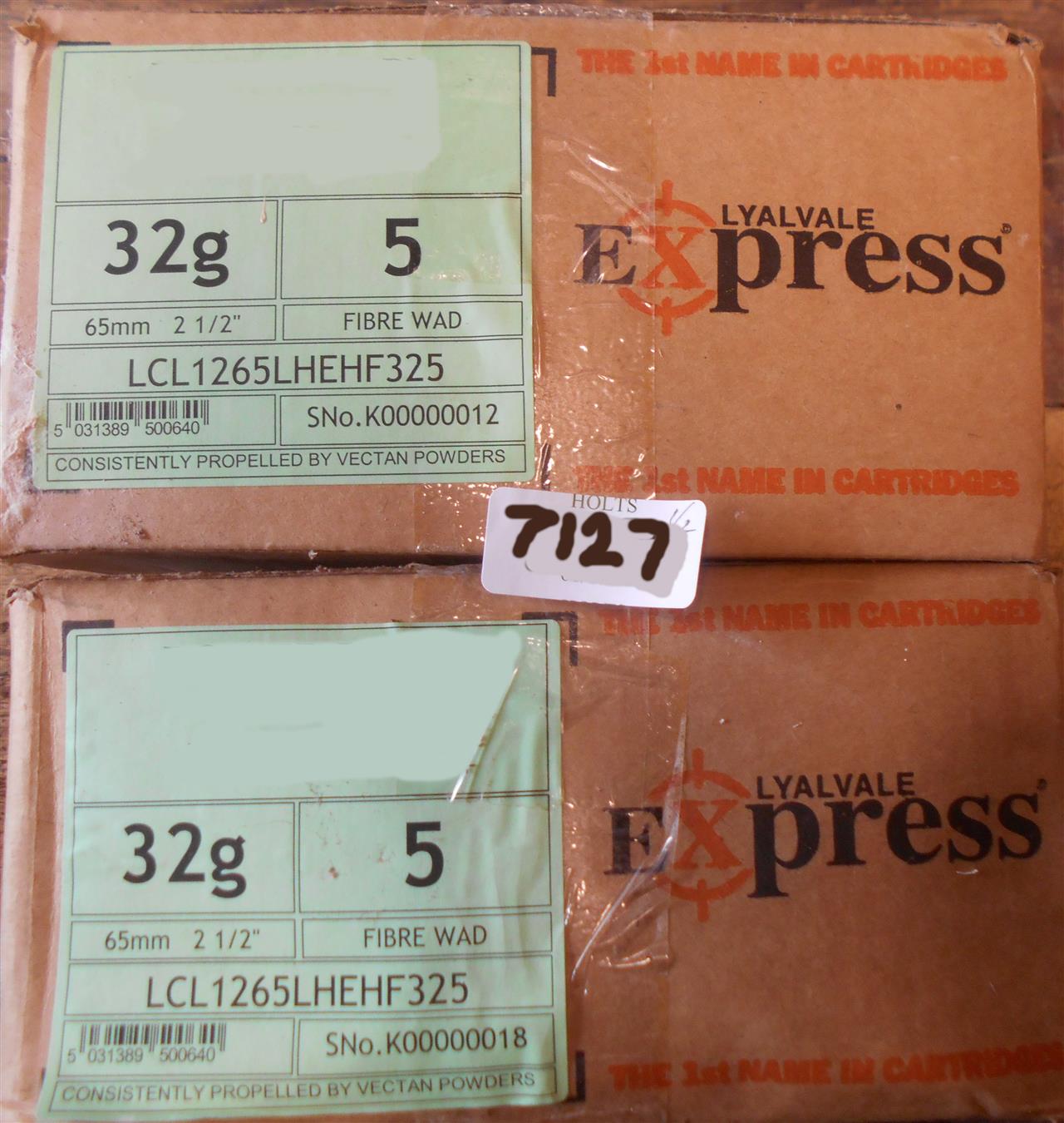 500 12 BORE CARTRIDGES BY LYALVALE EXPRESS, 5 SHOT, 2 1/2in, 32grm FIBRE WAD Please be advised that cartridges/ammunition, primers, primed cases, blanks and percussion caps cannot be sent to you by post or carrier. If you wish, you can book a collection at one of our regional valuation days, or collect from our offices at PE31 6HA in Norfolk