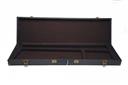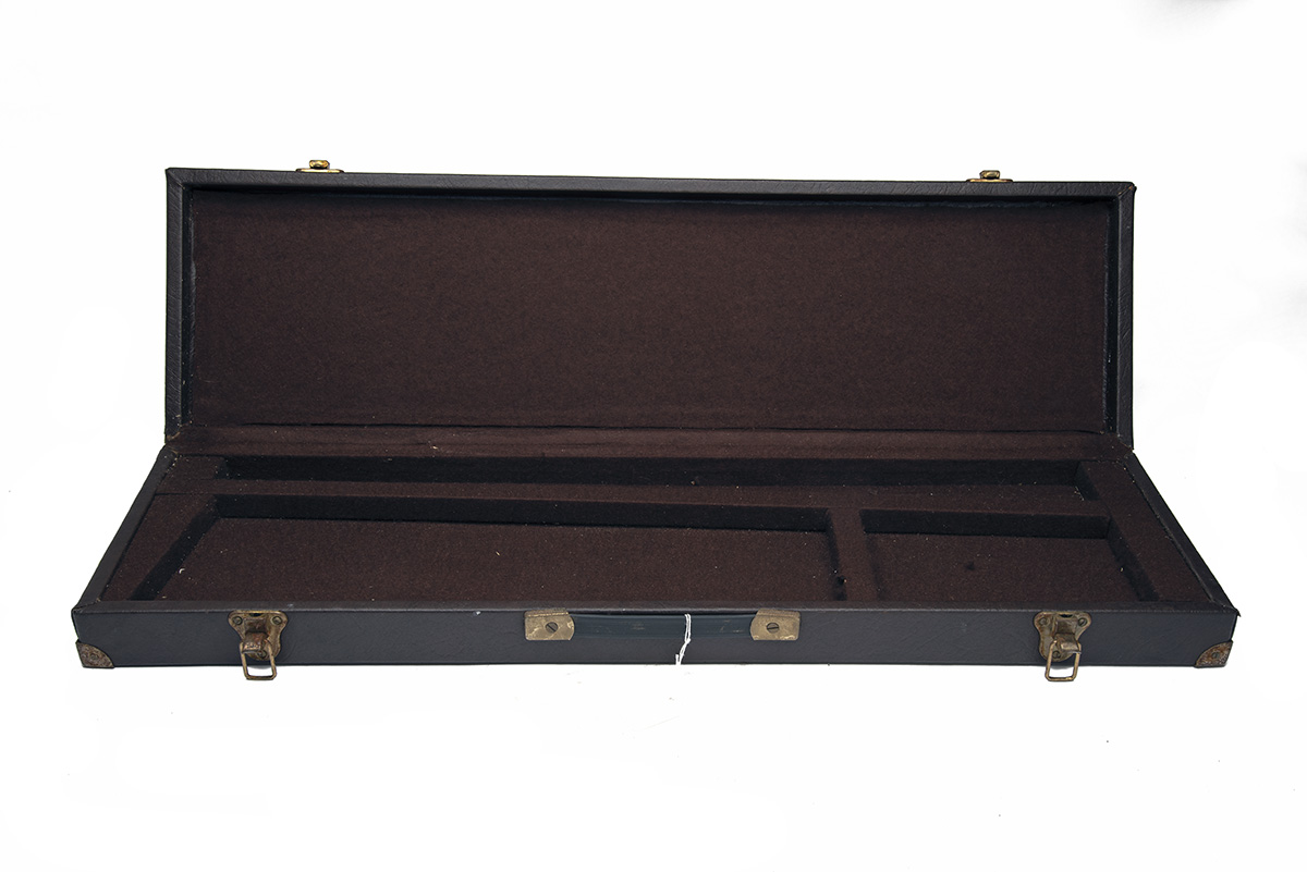 A FAUX LEATHER SINGLE GUNCASE, fitted for 28in. barrels, the interior lined with brown baize, 2 x brass clasps