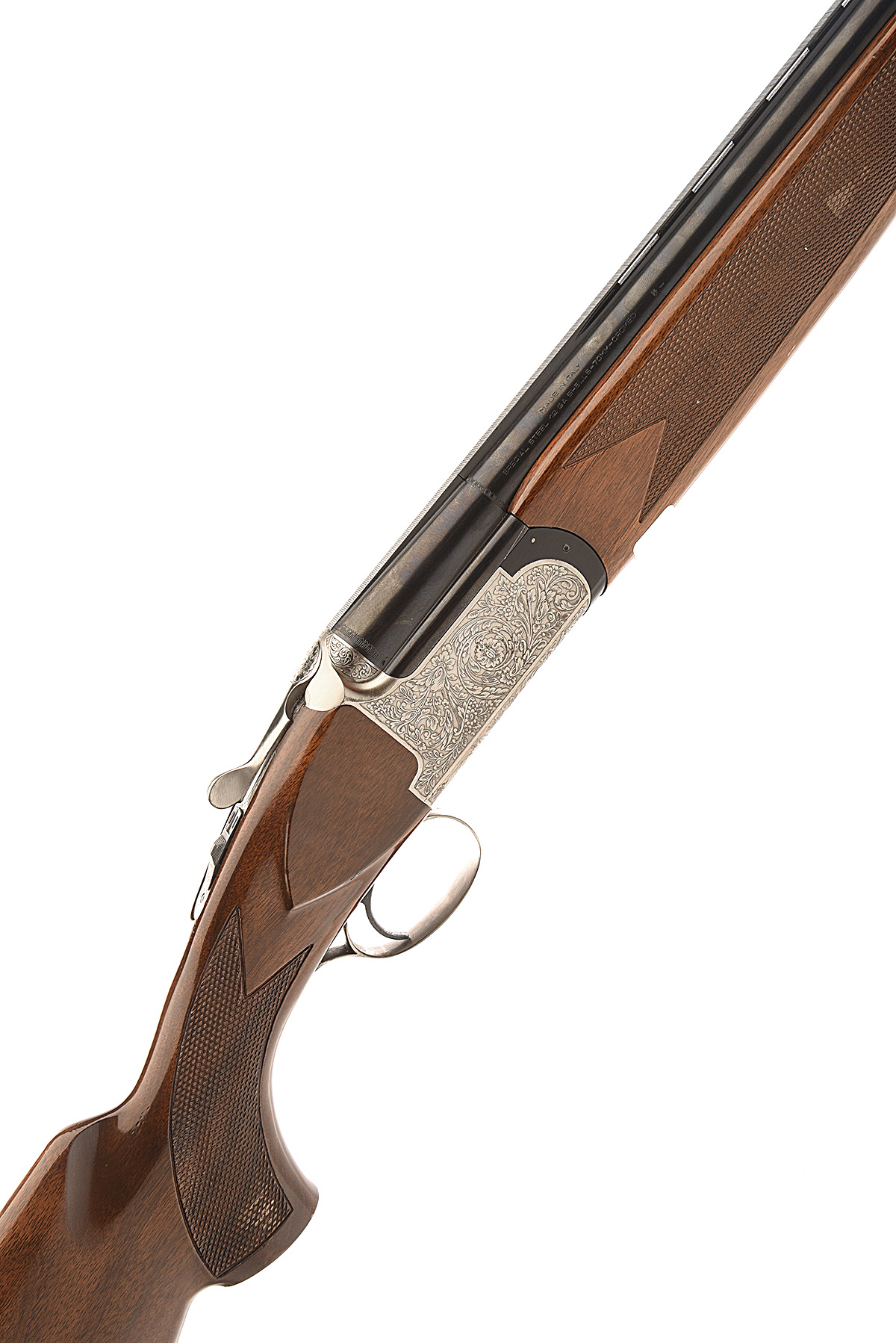 BARASINGHA 12-BORE SINGLE-TRIGGER OVER AND UNDER EJECTOR, serial no. 4164756, dated 1980, 28in. nitro barrels with 7mm ventilated matt top-rib (dented), 2 3/4in. chambers, bored approx. true cyl. and 3/4 choke, hold-open toplever, manual safety with integral barrel selector switch, floral scroll engraving, 14 1/4in. pistolgrip stock including buttplate