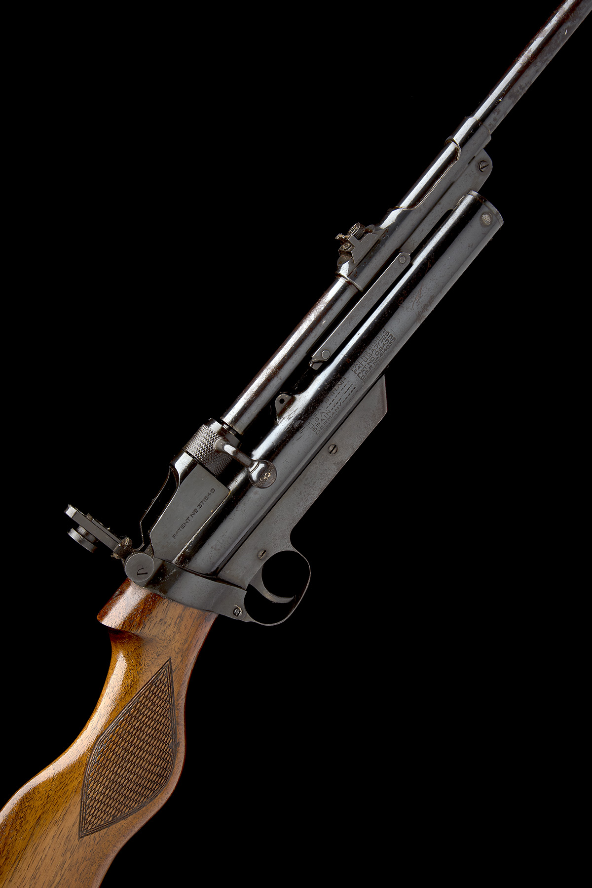 circa 1937, with blued 25 1/2in. matching number barrel, ramp fore-sight, elevating rear-sight, bolt-action barrel locking, blued air-chamber with make and patent details (pin absent from anti-beartrap), no provision for safety catch to trigger unit, semi saw-handled walnut butt-stock and no provision for fore-end, strong amount of blued finish remaining, 42in. overall, weight approximately 6 3/4lbs.
