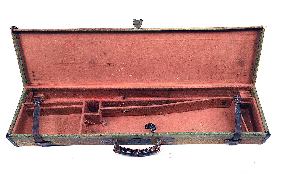 A CANVAS AND LEATHER SINGLE GUNCASE, fitted for 31in. barrel, the interior lined with pink baize, brass lock (key missing)