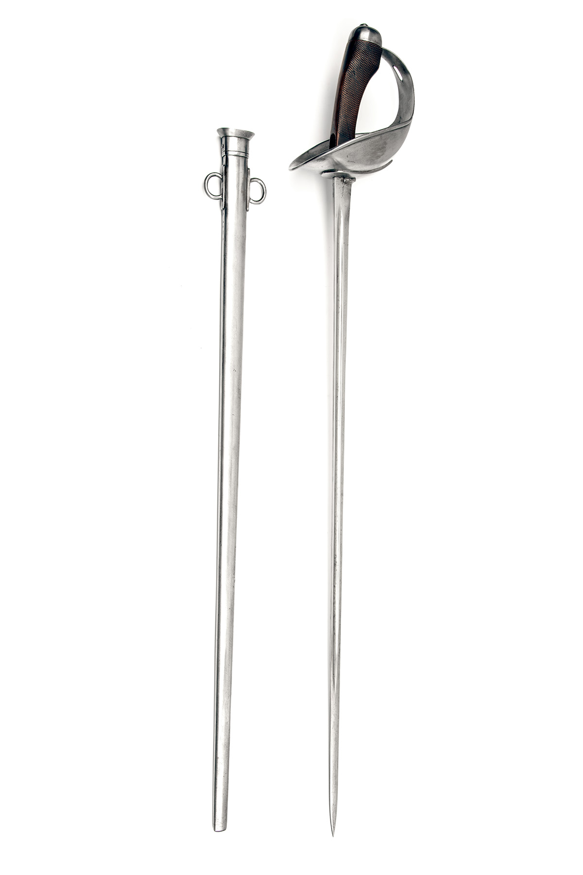 ordnance inspector's stamp for August 1915, with straight narrow blind-fullered 35in. blade, pattern mark to back edge near hilt, sheet iron plain bowl guard with rolled edge, composite chequered 'pistol-grip' hilt with depression for thumb and domed pommel, complete with its iron scabbard with twin fixed suspension rings, overall length 44 1/2in., weight approx. 4lbs.