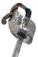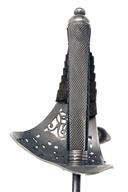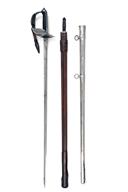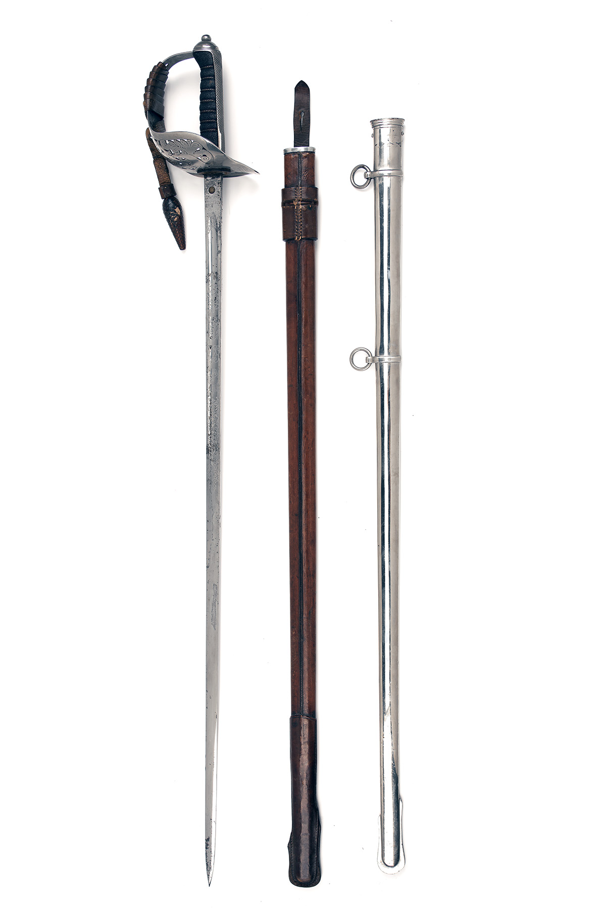dated for 1911, with straight spear-point 32 3/4in. blade etched with arabesques, crowns and coat of arms, 'GRV' device, broad blind fullers, nickel-plated half basket hilt pierced with honeysuckle leaves and the device of 'GRV', the outer face of the thumb-guard inscribed 'PRESENTED TO F.S. FLETCHER ESQ. BY THE MEMBERS OF THE SERG'TS MESS, Ist C.B.R.F. 16.10.1911', sharkskin grip with wire binding, chequered back-strap and domed pommel, complete with its leather field knot, leather scabbard and nickel-plated dress scabbard (minor spot-stains only)