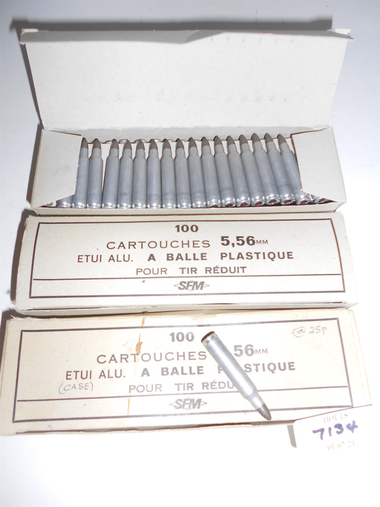APPROXIMATELY 270 ROUNDS 5.56 (.223) AMMUNITION, ALUMINIUM CASES & PLASTIC BULLET HEADS, REDUCED CHARGE BY SFM (FRANCE), comprising of three issue training round cartons of 100 rounds in each.