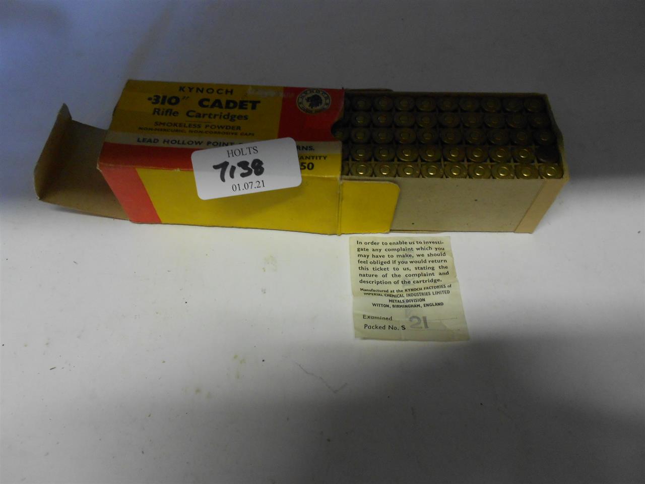 50 ROUNDS .310 CADET AMMUNITION BY KYNOCH, 120 GRN HP Please be advised that cartridges/ammunition, primers, primed cases, blanks and percussion caps cannot be sent to you by post or carrier. If you wish, you can book a collection at one of our regional valuation days, or collect from our offices at PE31 6HA in Norfolk