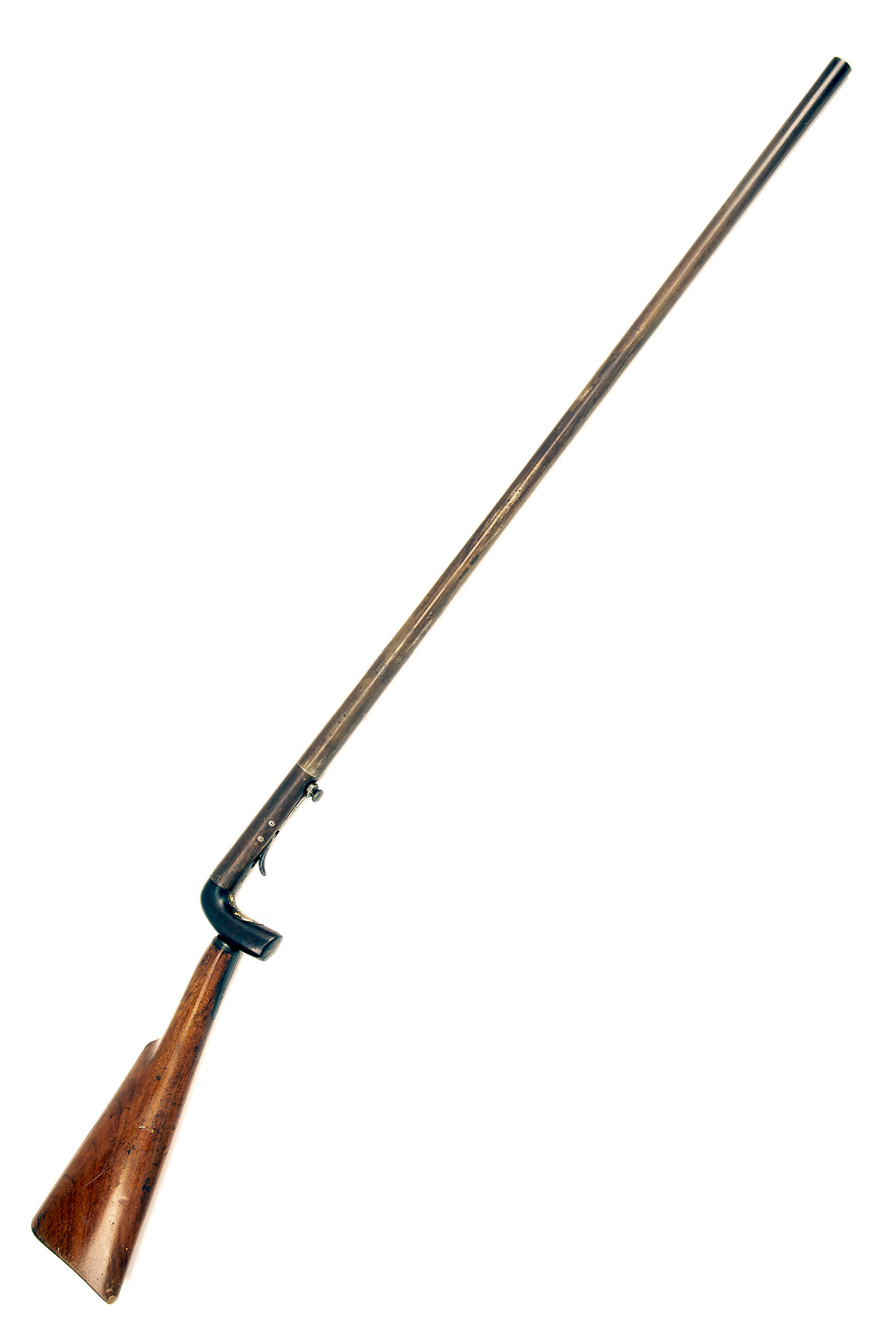 English circa 1845, with round turn-off twist 29in. barrel, Birmingham proofs, round action with under-hammer and exposed trigger (at fault), walnut walking-stick handle with threaded aperture to rear to accept a detachable butt-stock (included), overall length 46in. including butt-stock, weight approximately 3 1/8lbs.
