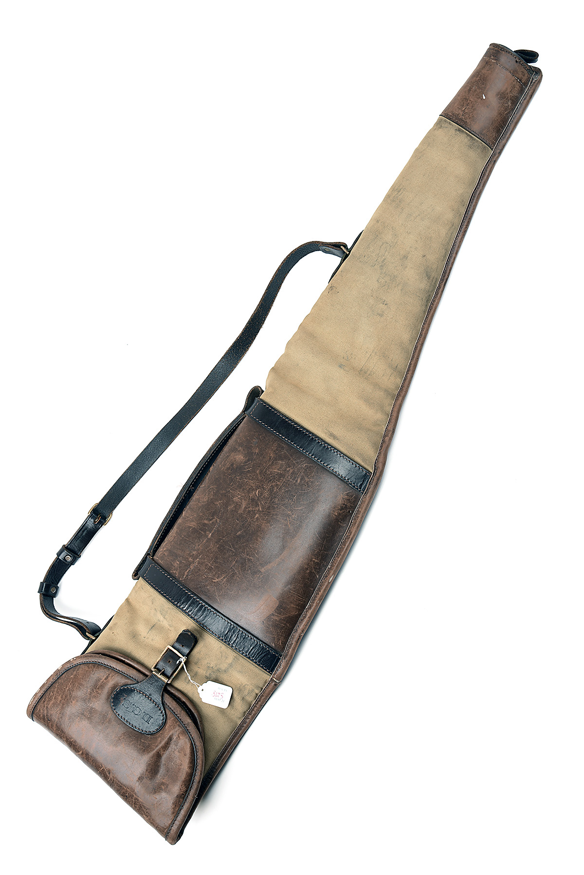 A CANVAS AND LEATHER SINGLE RIFLE SLIP, with canvas and leather shoulder strap, brass fittings, approx. 47in. overall length
