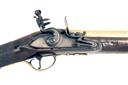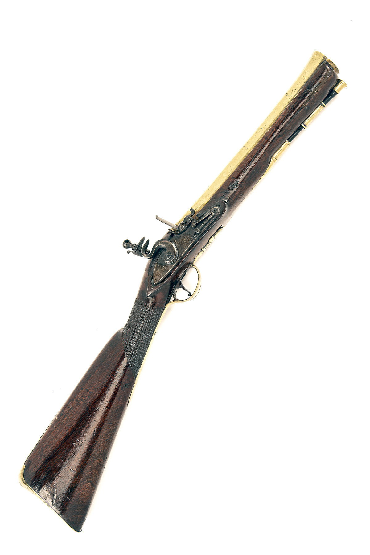 English circa 1790, with plain round 11 7/8in. thick-walled brass barrel, moulded band at breech, London proofs and obscured maker's mark, squared iron solid top-tang, plain iron bevel-edged lock with swan-necked cock and semi rainproof pan, roller frizzen-spring, walnut full-stock coarsely chequered at the wrist (losses to wood around lock and rear of tang, cracks and repairs along fore-end with further small losses), plain brass furniture with triple-stepped top-spur to heel-plate, rolled edges to the trigger guard, acorn finial and replacement ramrod, weight approximately 5 1/2 lbs., overall length 27 1/4in.