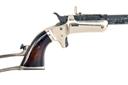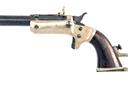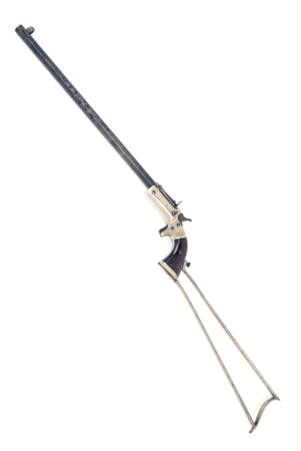 circa 1890, with two-stage 15in. barrel (traces only of original finish), tunnel fore-sight with moulded blade to top, elevating buckhorn rear-sight forward of breech with elevating blade, the left hand side top-flat signed 'J. STEVENS & CO. CHICOPEE FALLS MASS. PAT. SEPT 6 1864', push-button barrel release to left side of frame, external hammer with firing pin bushed in frame, moulded and rounded nickel-plated iron receiver with spur trigger (much plating remaining), smooth flared walnut grips, the back-strap with threaded aperture and the heel cut with a dove-tail to accept a nickel-plated wire skeleton stock (present, matching number), 28 3/4in. overall with stock fitted, weight approximately 2 1/4lbs.