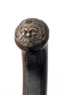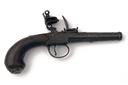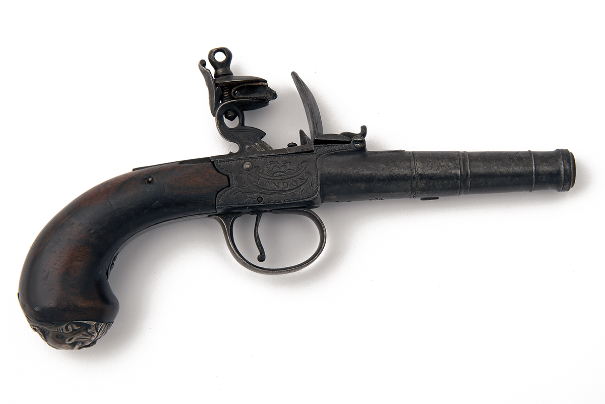 hallmarked Birmingham 1782, with banded turn-off 2 3/8in. barrel (frozen), private proofs at breech, border engraved squared boxlock central hammer action signed in banners on the left 'ARCHER' and the right 'LONDON', smooth walnut butt with bulbous pommel fitted with a silver grotesque mask cap, possibly maker-marked 'CF' for Charles Freeth and sliding trigger bow safe, the whole an older re-black, overall length 8in., weight approximately 5/8lbs.
