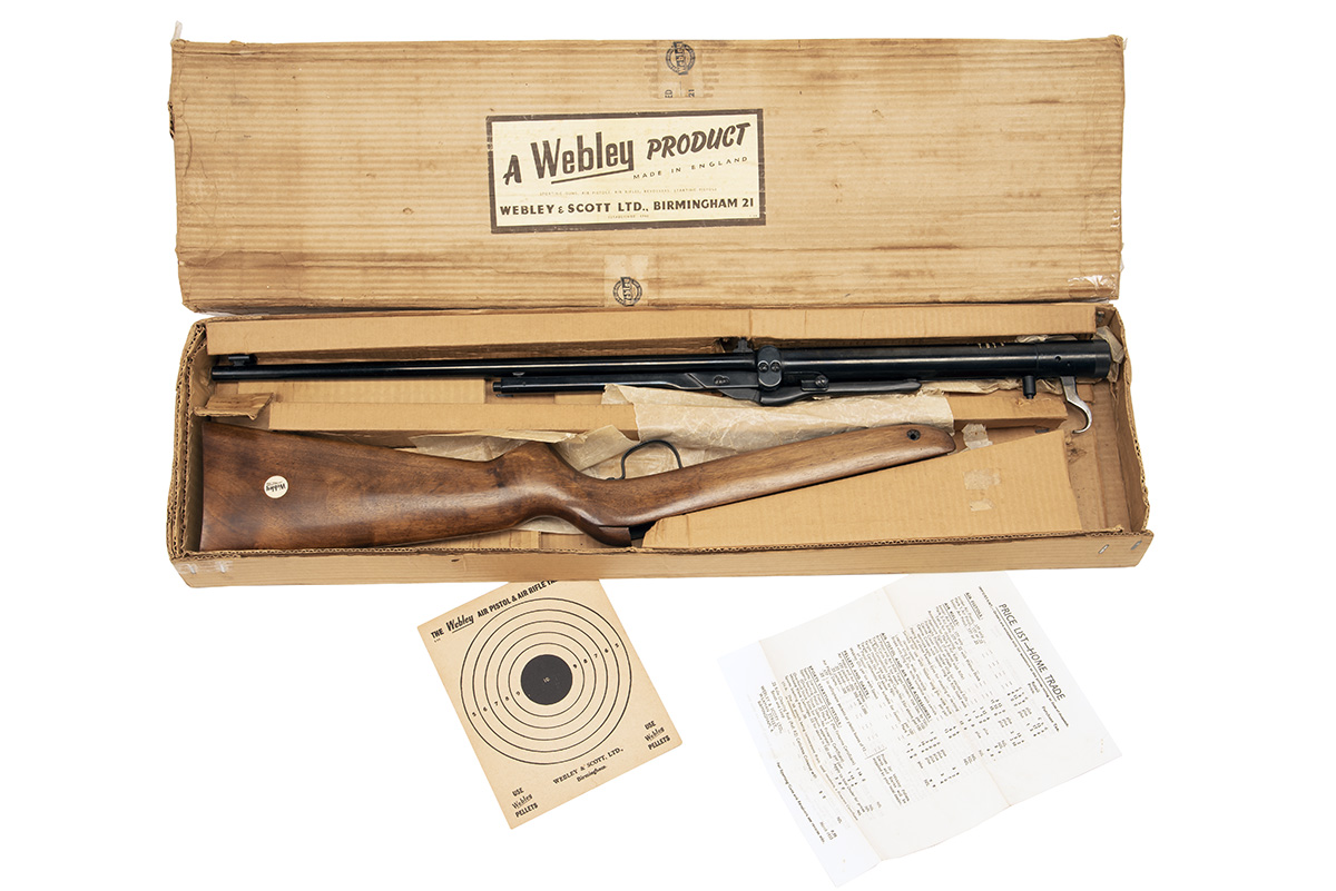circa 1958, series three model with blued sighted barrel retaining fore-sight protector, no provision for a telescopic sight, make and model details stamped to the air chamber, figured walnut half-stock of rounded type (matching number) and push-button underlever, the whole remaining in apparent unfired condition and dismantled in its original plain card carton (mild staining) with 'Webley & Scott 21' buff label to outer lid, the interior still retaining the instruction book, notes from Webley, grease paper and a target
