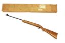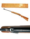 for 1959-65, with 18in. blued barrel retaining fore-sight protector, plain air-chamber etched with make and model and with twin type telescopic sight mount and walnut three-piece laminated half-stock, the whole in apparent unused condition, complete with its card carton retaining pellet sample and boxed 4x20 telescopic sight with instructions, missing oil bottle, box distressed
