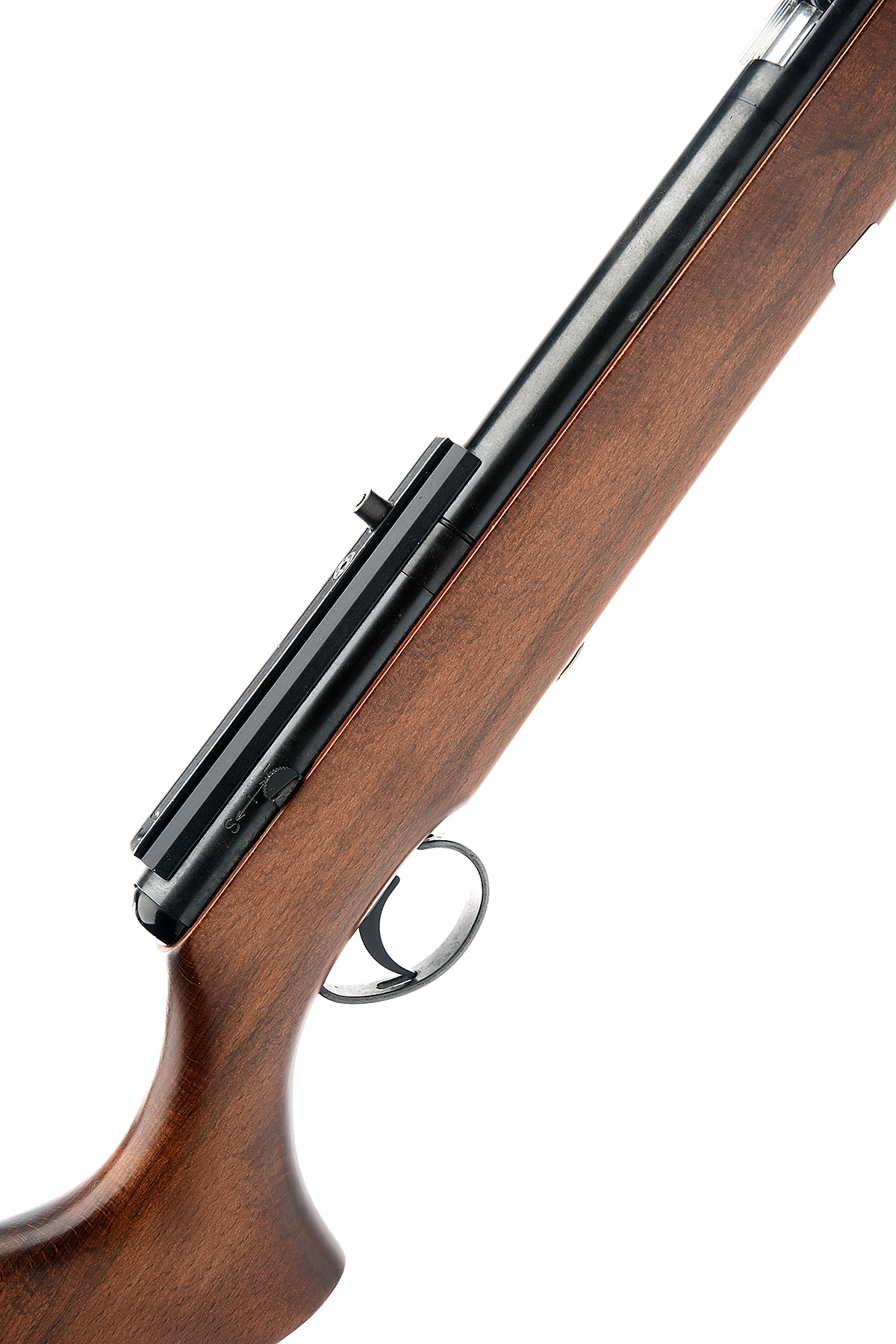 with blued 14 1/2in. barrel including built-on sound moderator, automatic breech opening on a lever, blued air reservoir with applied sight rail and beech half-stock, tested, 40 1/2in. overall, collector's condition