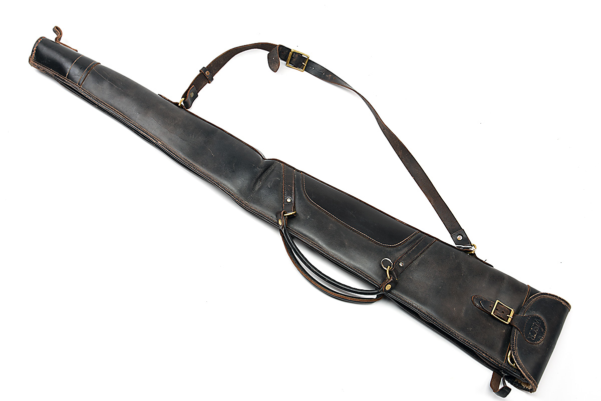 A LEATHER FLEECE-LINED SINGLE GUNSLIP, with leather carry handles, brass fittings