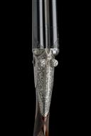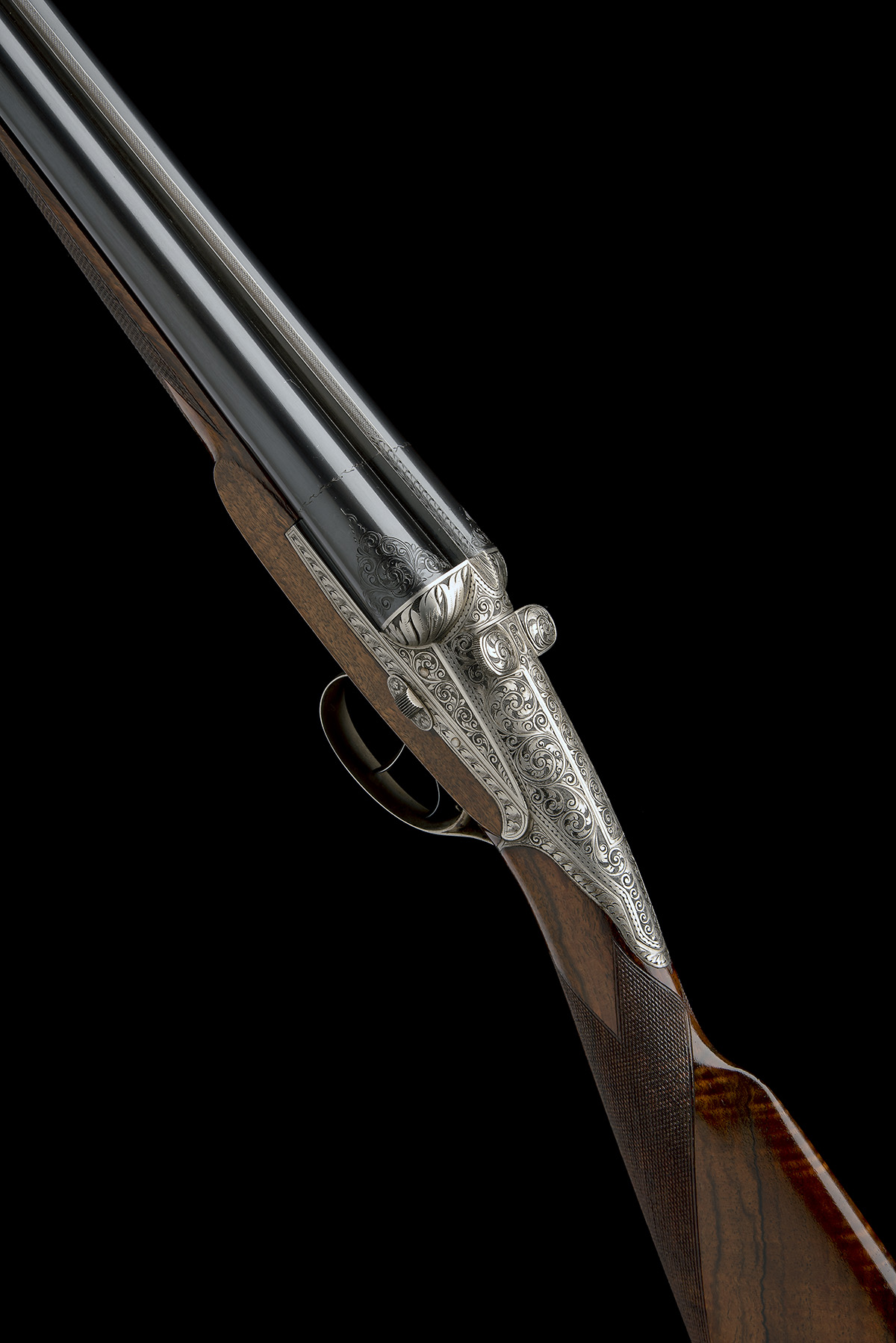 for 1978, 27 1/2in. (70cm) nitro monobloc barrels with matt top rib and no under rib, the breech ends with bold acanthus scroll detailing, 11 punch marks, 2 3/4in. chambers, bored approx. imp. cyl. and 1/2 choke, sprung sliding-breech with converging obturator discs, manual side safety, the underside with push button barrel release, bold bouquet and scroll engraving on a matted background, the fences carved in relief with stylised leaf designs, old silver finish overall, 15in. figured stock including pale horn buttplate, the fore-end with dark horn finial, weight 6lb. 8oz.