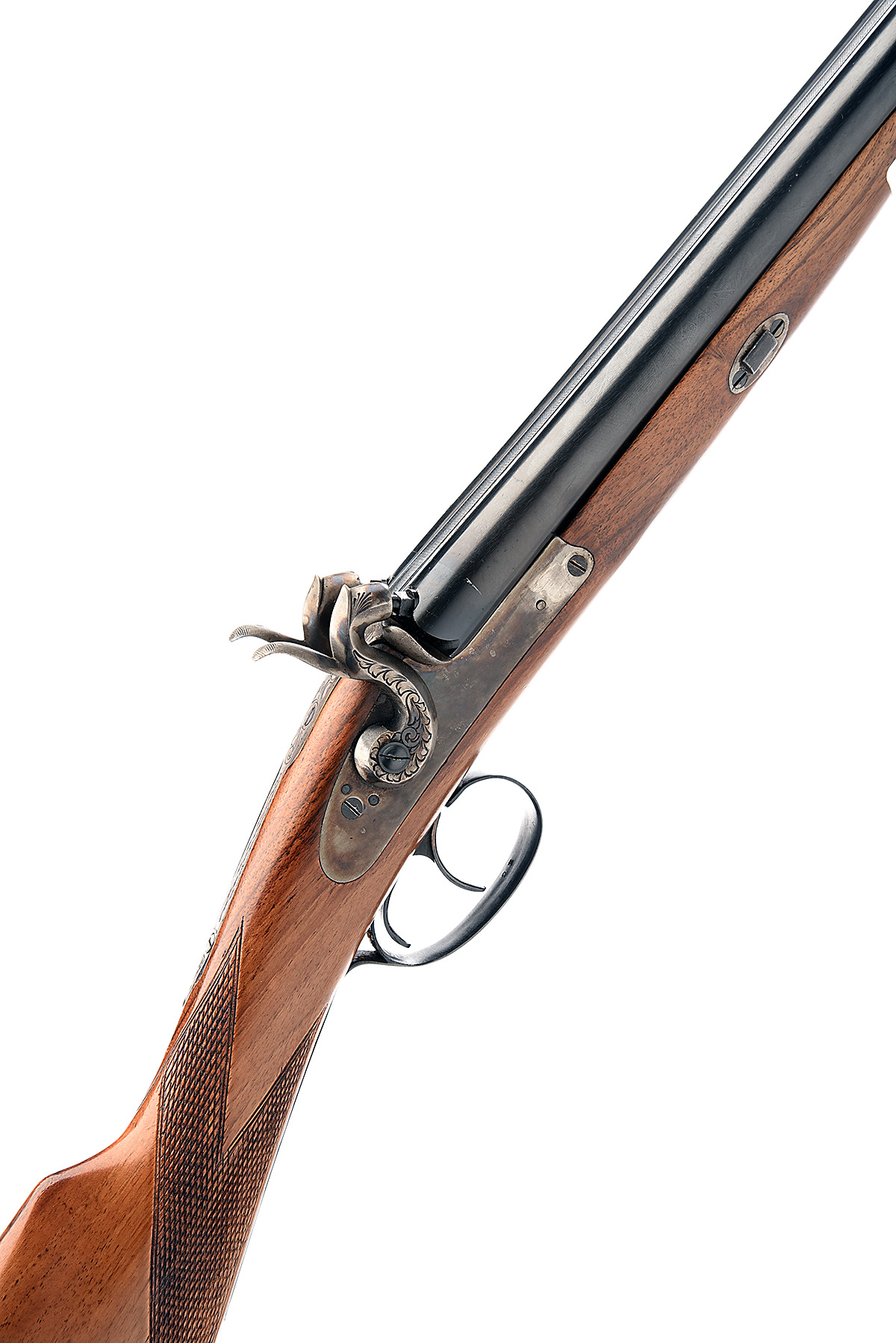 A REPRODUCTION 12-BORE PERCUSSION DOUBLE-BARRELLED SPORTING-GUN SIGNED PEDERSOLI, serial no. 4063,