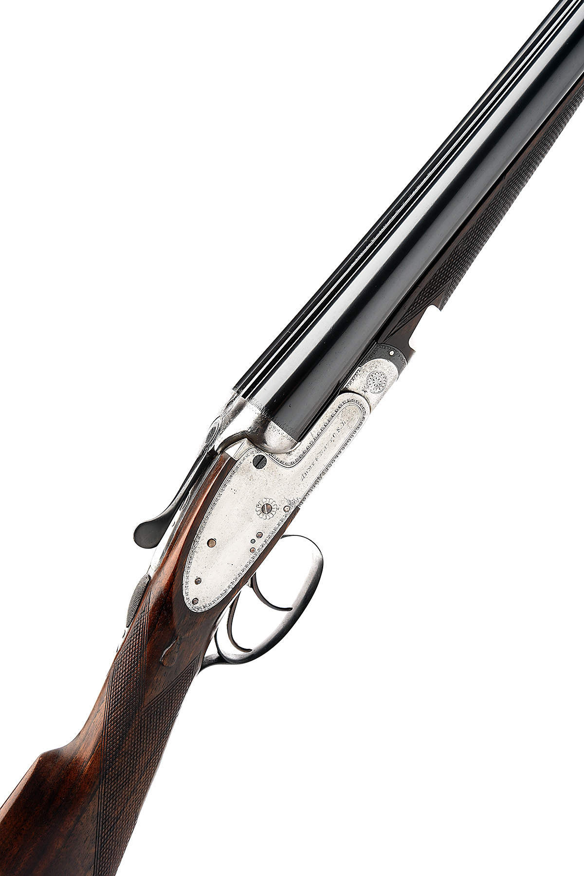 ARMY & NAVY 12-BORE SIDELOCK EJECTOR, serial no. 45517, circa 1905, 30in. nitro barrels, rib engraved 'ARMY & NAVY C.S.L. LONDON.', 2 1/2in. chambers, bored approx. true cyl. and 3/4 choke, treble-grip action, removable striker discs, automatic safety, cocking indicators, border engraving, brushed finish (some dents to lockplates), 14 1/4in. stock including buttplate, weight 6lb. 13oz., in a wooden box