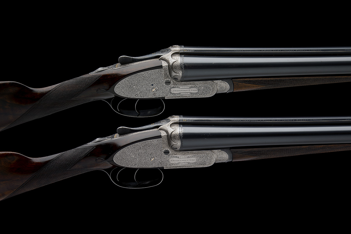 circa 1887, 29in. nitro reproved barrels, the ribs engraved 'JAMES WOODWARD & SONS. 64, ST. JAMES'S STREET. LONDON. MADE OF SIR JOSEPH WHITWORTH'S FLUID PRESSED STEEL' and gold-inlaid '1' and '2' at the breech ends, 2 1/2in. chambers, bored approx. true cyl. and 1/4 choke, slightly loose on actions, No.2 with some pits, treble-grip actions with hidden third bites, removable striker discs, arcaded side-clipped fences, toplevers gold-inlaid '1' and '2', automatic safeties with gold-inlaid 'SAFE' details, gold-inlaid cocking-indicators, ejectors at fault, profusely engraved with fine acanthus scrollwork, the makers name in elaborate cartouches on the lockplates, brushed bright and reblued finish overall, 14 1/2in. replacement straight hand stocks (cracks to rear of lockplates) including buttplates, weight 6lb. 7oz.
