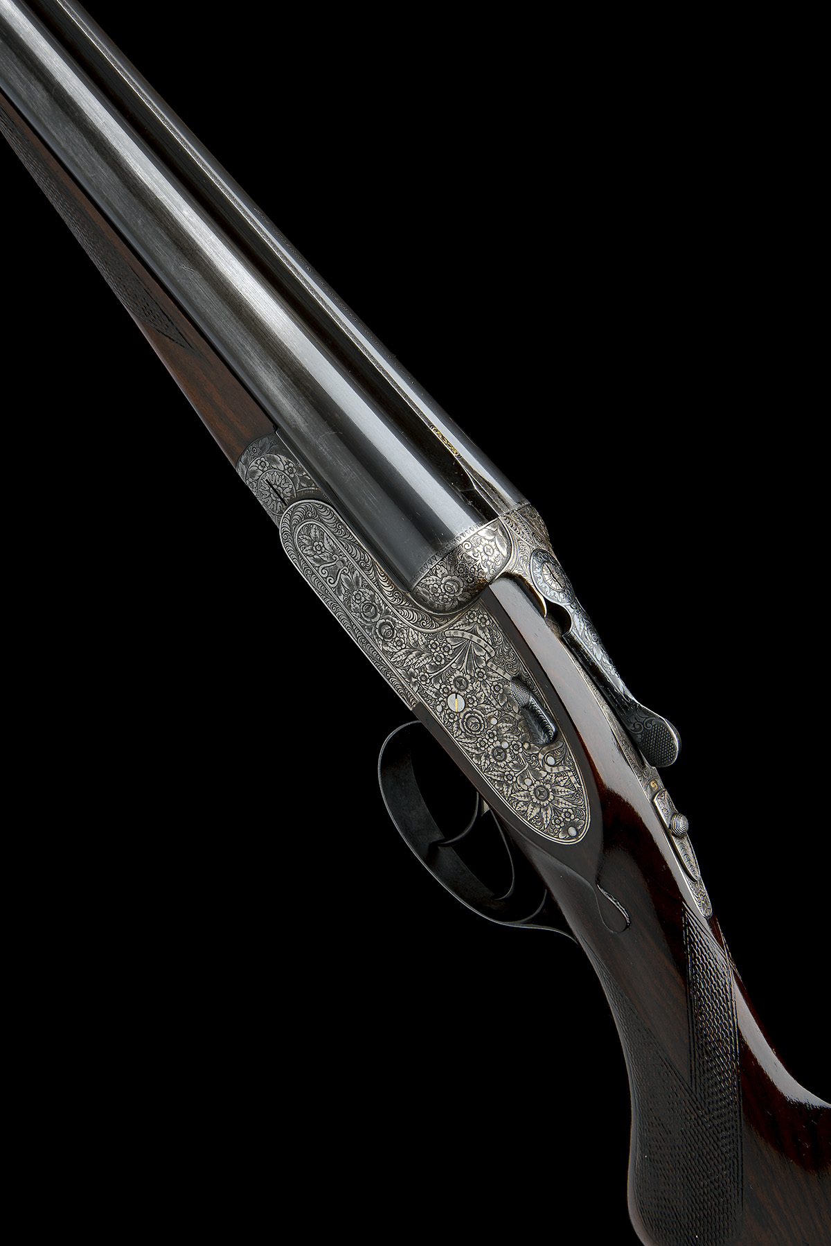 for 1970, 25in. nitro chopperlump barrels, Churchill rib gold-inlaid 'AYA' at the breech end, 2 3/4in. chambers, bored approx. 1/4 and 1/2 choke, removable striker discs, automatic safety, hand-detachable lockplates, gold-inlaid cocking-indicators, articulated front trigger, rolled edge triggerguard, the action, lockplates and furniture profusely engraved with floral, scroll and ribbonwork, 14 1/4in. semi-pistolgrip stock, weight 6lb. 5oz; together with its original proof certificate