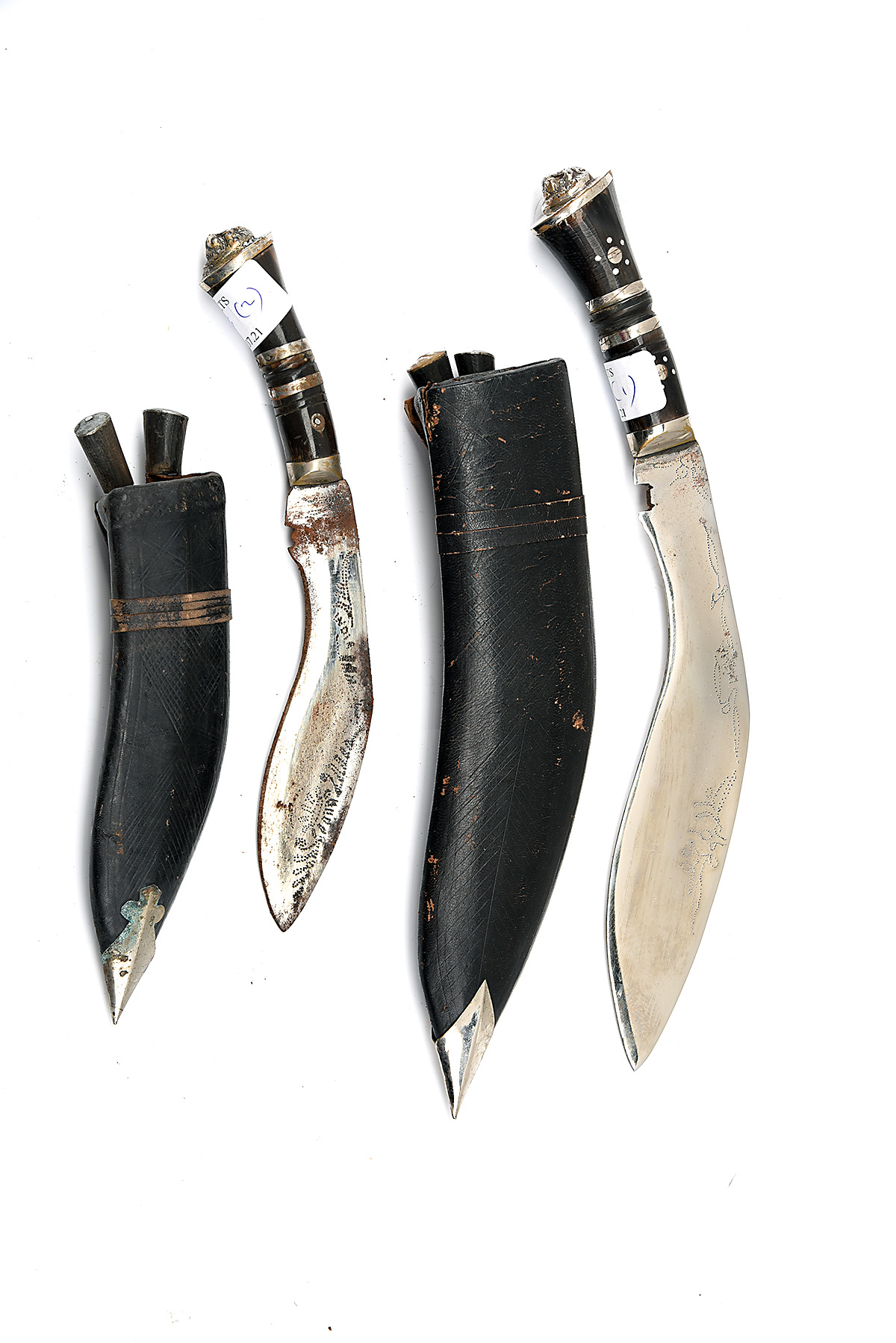 A PAIR OF THREE SHEATHED TOURIST KUKRI KNIVES circa mid 20th Century, Indian, one with 8 1/2in. decorated blade, hard-wood hilt with white metal decoration and lion-head pommel, together with two miniature fruit-knives all contained in a leather-covered soft-wood scabbard with white metal chape, together with a similar smaller set with the main knife having a 6in. blade, all three knives heavily rusted, 14in. and 11in. overall