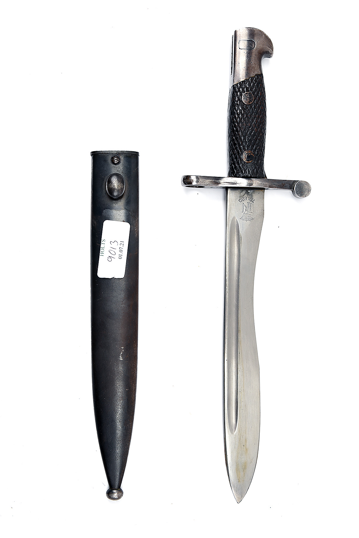 A SPANISH MAUSER MODEL 1941 'BOLO' BAYONET mid-20th Century, with toledo Arsenal mark and '3692 / F' on ricasso, hard-wood grips, together with a scabbard numbered 6684, 15 3/4in. overall