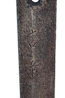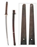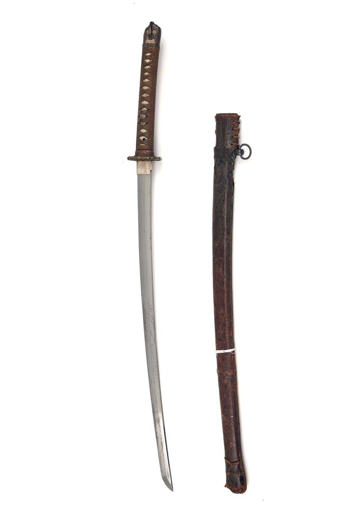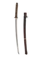 the 26in. blade almost certainly a smith-made arsenal example (some mild speckled staining), the 'hamon' barely visible but extending around the kissaki, silver washed 'habaki', cast carved and moulded 'tsuba', signature to both sides of tang, push-button scabbard lock, cotton bound ray-skin covered 'tsuka' and leather covered 'saya', 39 3/4in. overall, weight in scabbard approx. 3 7/8lbs.
