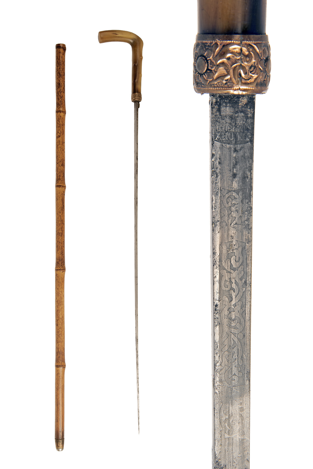 circa 1900, the 26 1/2in. narrow blade with deep blind fullers to both sides, the top face etched with panels of scroll and signed 'TOLEDO' (some pitting), the underside etched with similar scrolls and marked at the forte 'J. MORY ARMURIES, florally embossed brass collar with concealed release button (traces of gilding) and crooked horn handle, natural bamboo scabbard, 36 1/2in. overall