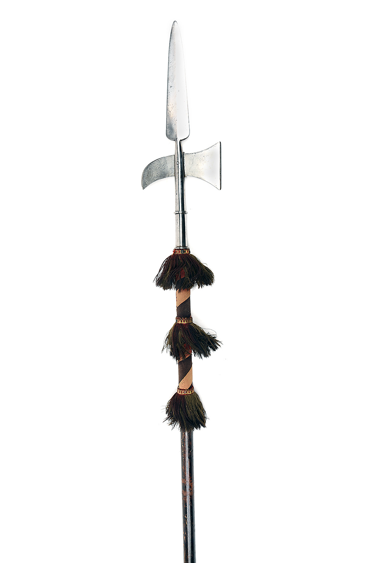 A VICTORIAN COPY OF A CONTINENTAL HALBERD late 19th Century. with 22in. heavily polished steel head, comprising 12in. spear, 3 1/4in. beak and 3 1/2in. blade with traces of heraldic beast engraving, tassled banding and worn felt grips on shaft, 87in. overall