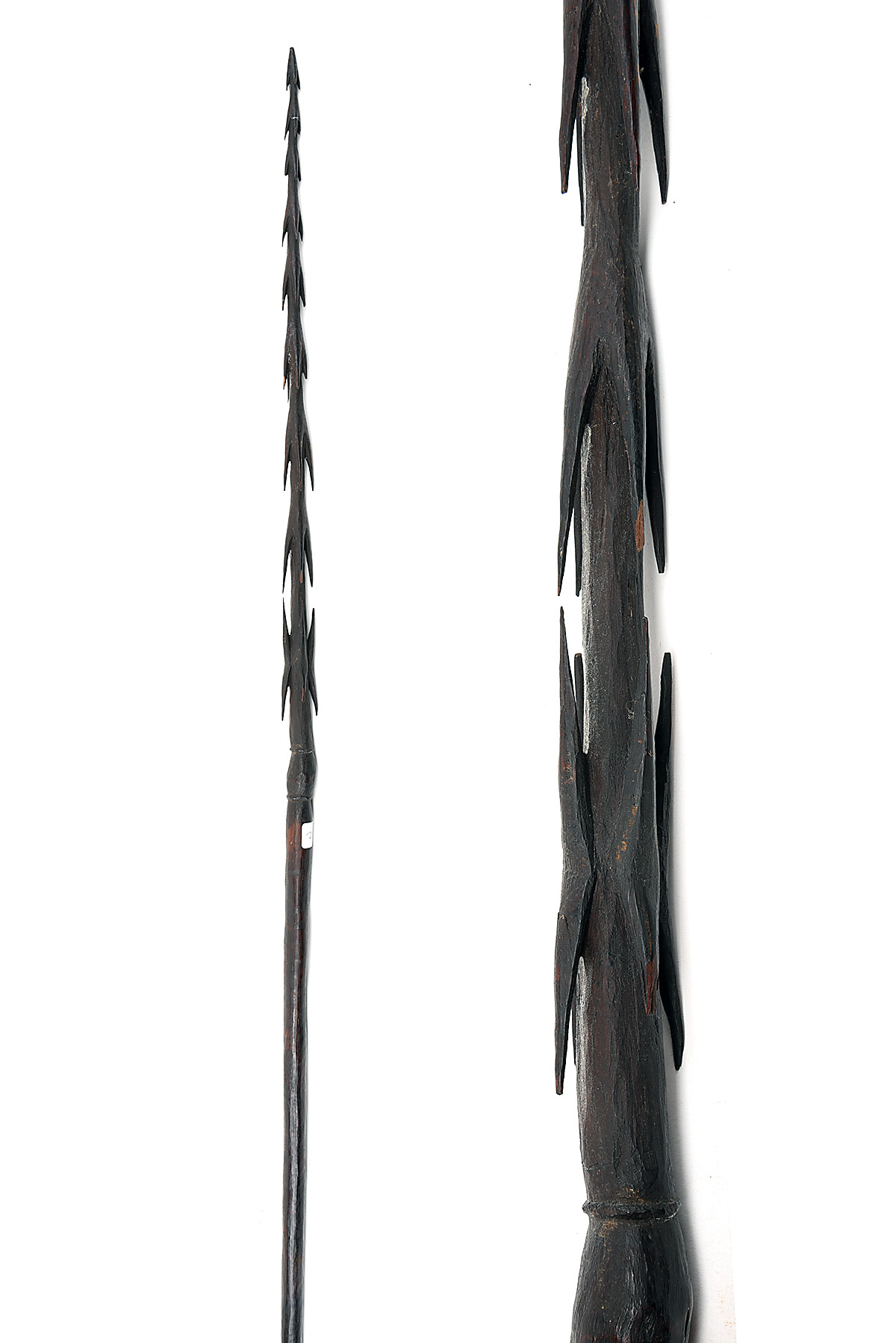 A MULTI-BARBED LIGNUM VITAE FISHING SPEAR believed 19th Century, and carved from a single piece, with 23in. head holding 10 quaduples of barbs (some with broken tips) and tapering shaft, 89in overall