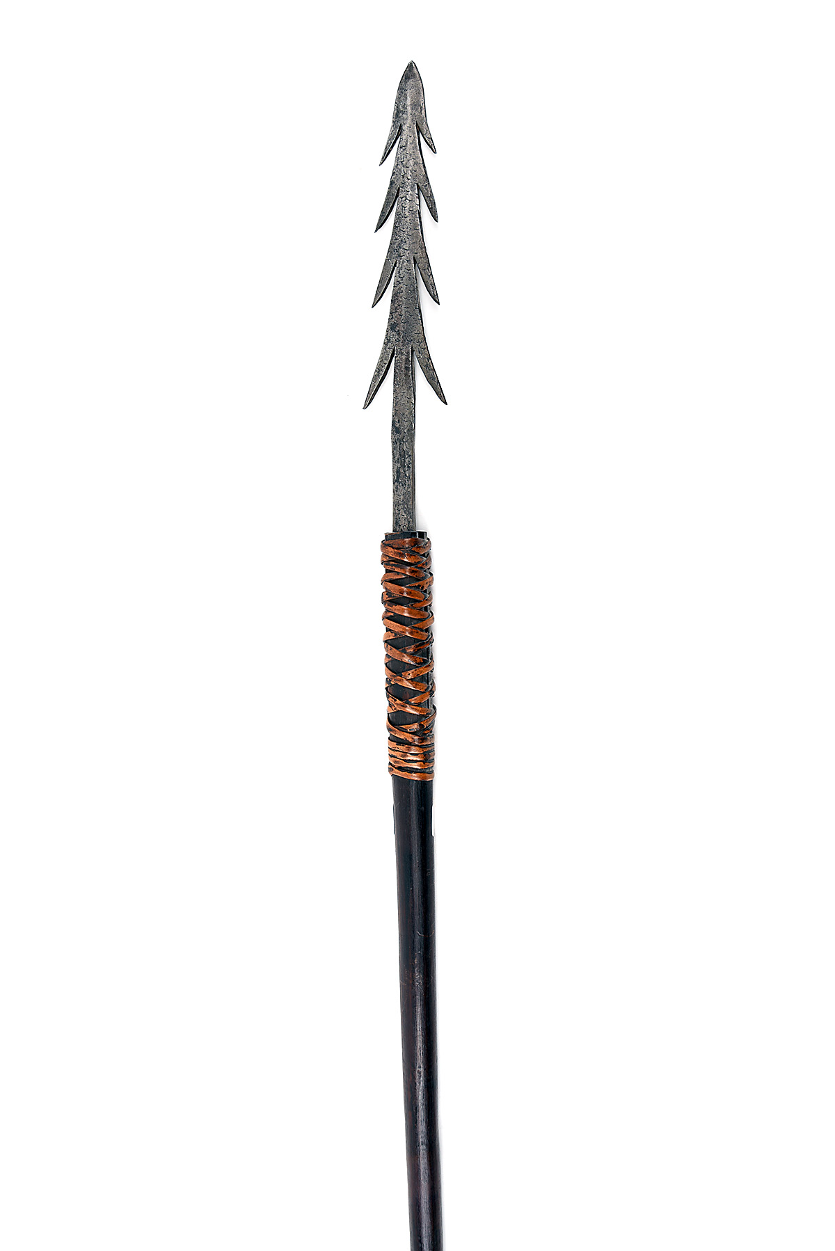 A FISHING SPEAR WITH MULTIPLE BARBS believed to be east African circa late 19th Century, with 12in. hand-forged steel head of four pairs of barbs, tang held in hard-wood shaft with rattan binding. brass grip, flattened and widened end to shaft, 93in. overall