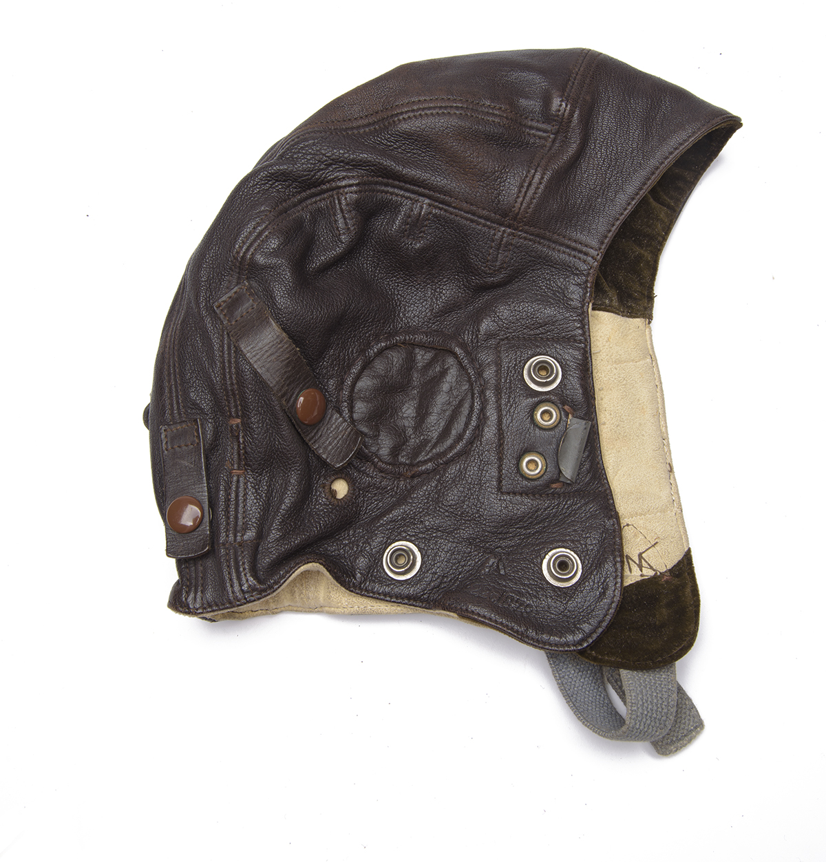 mid-20th century, late-pattern of dark brown Leather with a chamois lining and suede fore-head strip and tip to neck-flaps, with 'Broad Arrow' and 'REF. No, 22c/879 stamped into right flap, no wiring or receivers are fitted, and the holes for the receiver carriers have been sewn over
