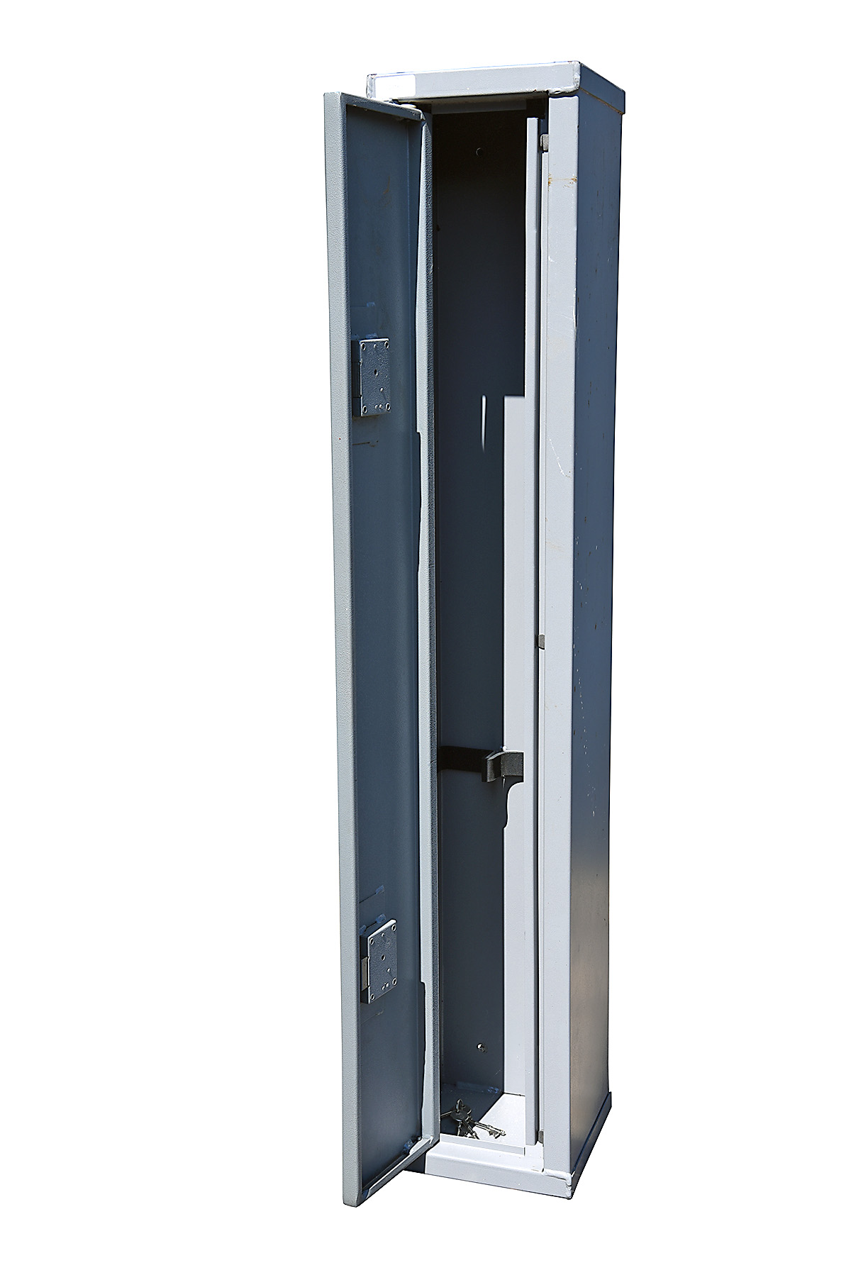 A STEEL GUN CABINET, fitted to hold two guns, measuring approx. 51in. x 9in. x 9in.