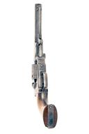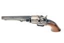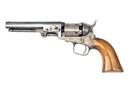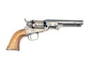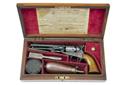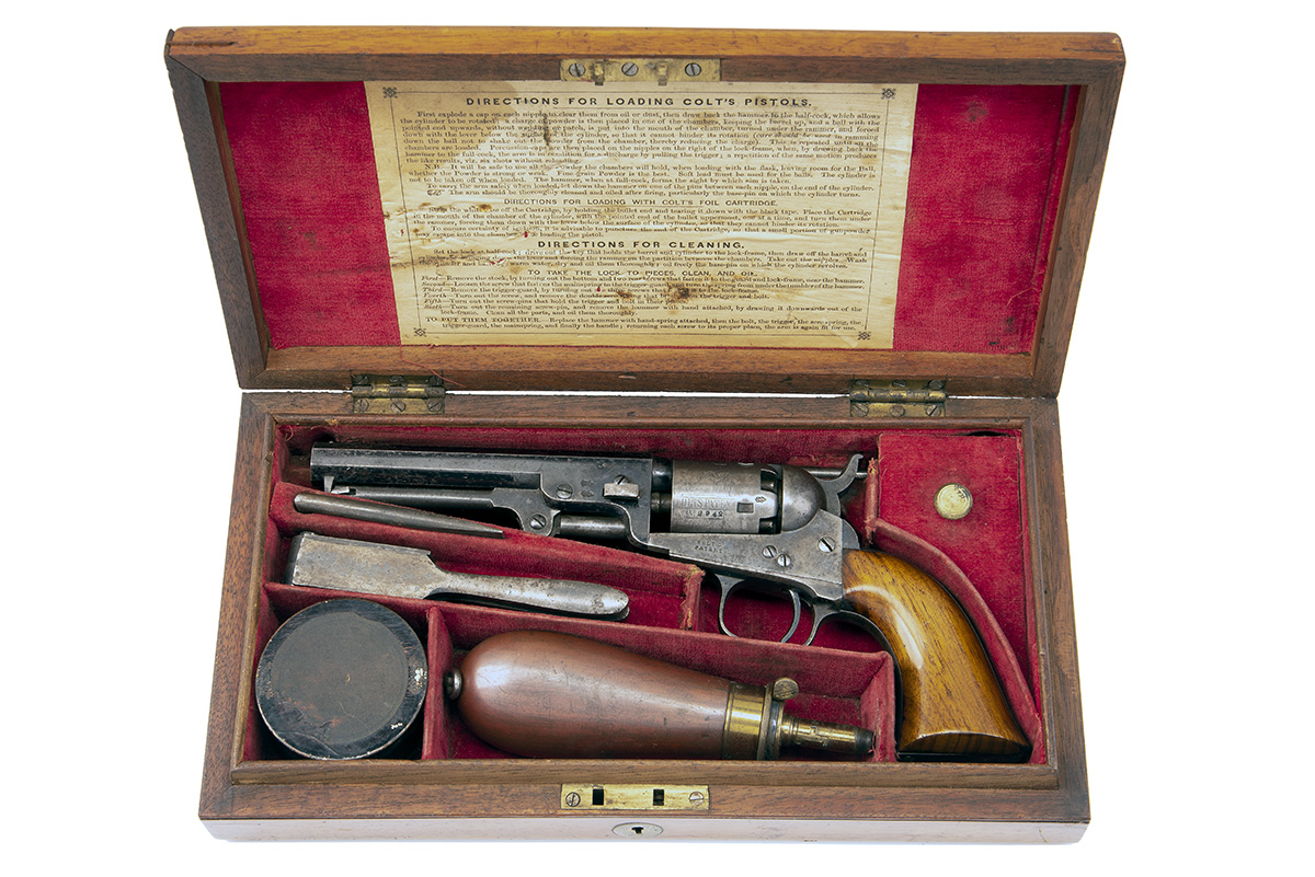 for 1854, with blued octagonal 5in. barrel signed on the top-flat in two lines within brackets 'ADDRESS COL COLT, LONDON' and retaining virtually all its original blued finish, five-shot cylinder roll engraved with a stagecoach hold-up scene, (finish lost) London proofs, open colour hardened iron frame marked 'COLT'S PATENT' and retaining a strong amount of colour, iron grip-straps and trigger-guard (finish faded), smooth walnut flared grip (small loss to left heel) and colour hardened under-barrel rammer, 10 1/2in. overall, complete with its American style walnut case with radiused edges, lined and compartmented in red velvet and retaining an original parchment instruction label inside lid, the tray also complete with an original James Dixon flask, Colt cleaning rod, signed double cavity iron bullet-mould and 'L' shaped nipple-key, brass escutcheons to lid and lock, the lock also retaining the original key