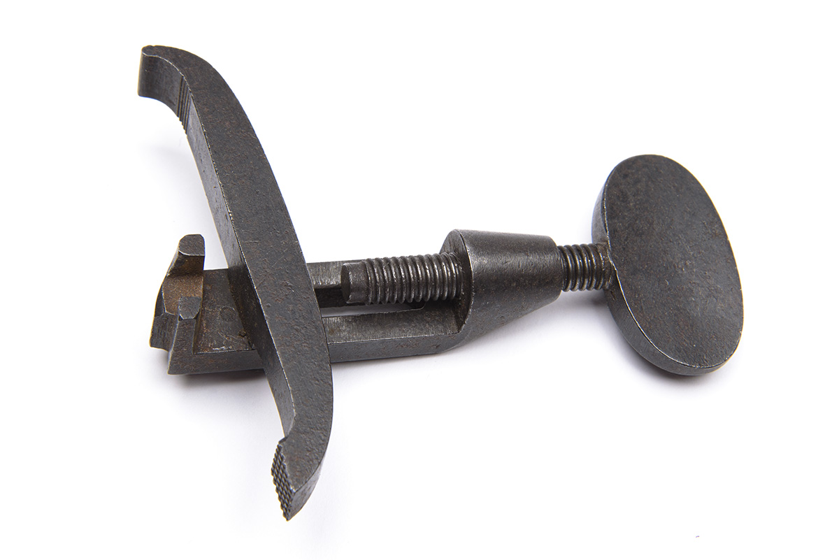A VINTAGE LARGE MAIN SPRING CLAMP, jaws at 3" possibly designed for a flintlock arm