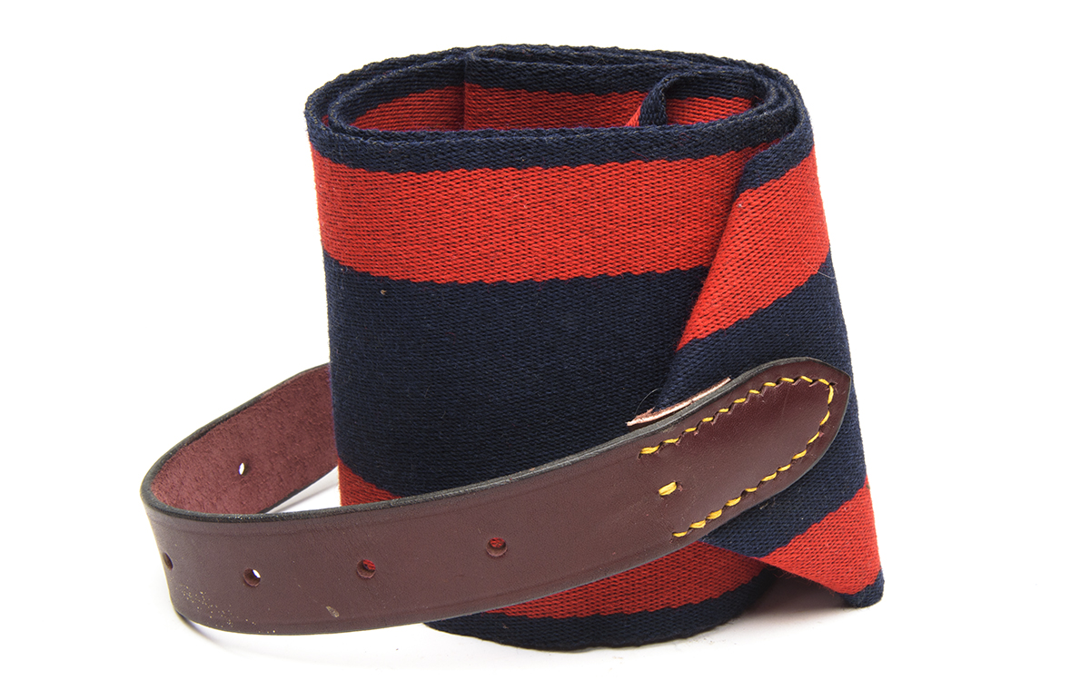 AN UNUSED 'FINE SHOOTING ACCESSORIES' RED AND BLUE CARTRIDGE BAG STRAP, 40"-53" x 5"