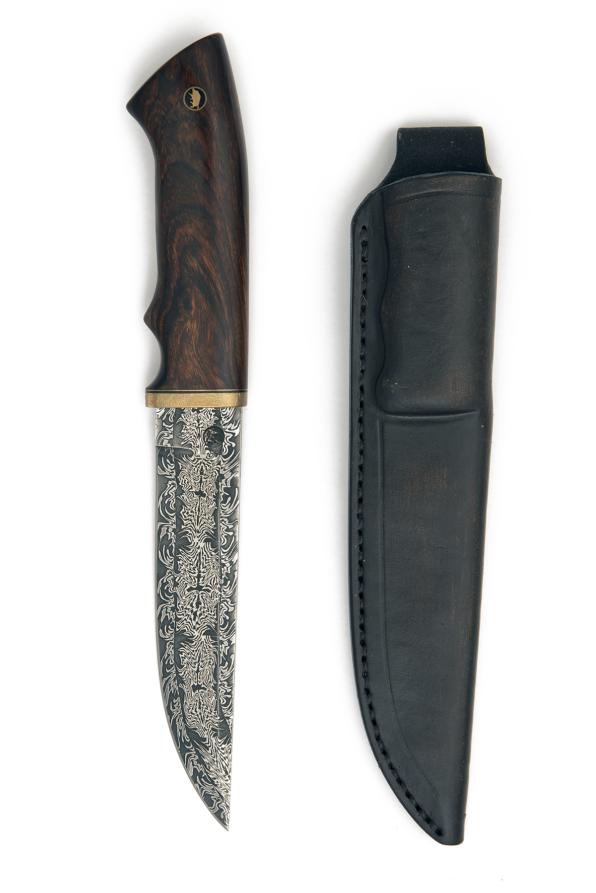 recent, with 5 1/2in. clip-point blade comprising of a central mosaic panels and with variegated damascus edge, maker's mark to right hand side of forte, walnut handle with a brass hammered bolster-guard and inlet with a brass wild boar pin, complete with its maker's custom sheath, the whole appearing new and unused, 11 1/2in. overall in scabbard