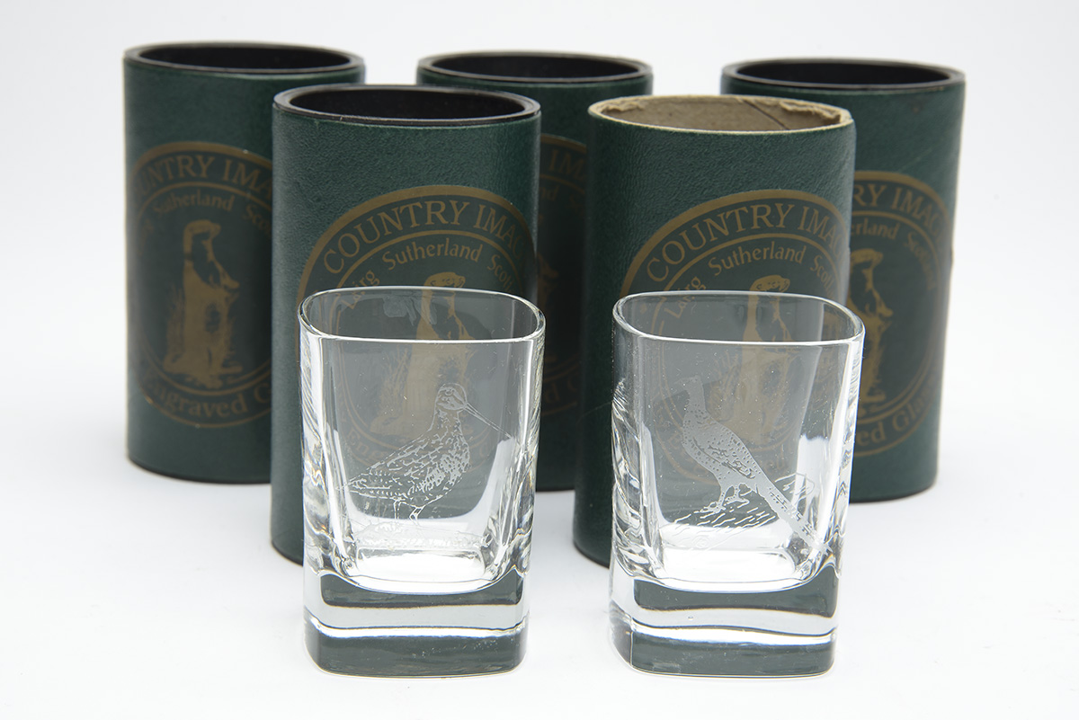 A SET OF FIVE 'COUNTRY IMAGES' GAME SCENE CRYSTAL SHOT GLASSES,