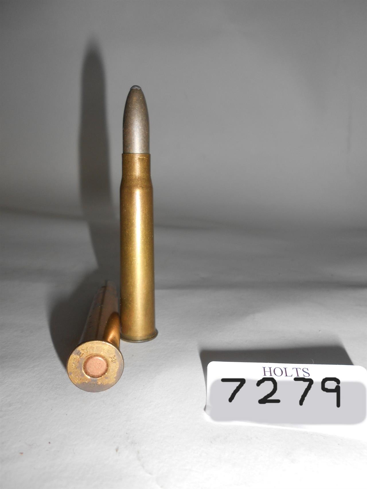 2 ROUNDS OF COLLECTABLE RARE PURDEY .369 FLANGED AMMUNITION, BASE MARKED 'PURDEY, BY KYNOCH, SOFT NOSE, SOME CORROSION Please be advised that cartridges/ammunition, primers, primed cases, blanks and percussion caps cannot be sent to you by post or carrier. If you wish, you can book a collection at one of our regional valuation days, or collect from our offices at PE31 6HA in Norfolk