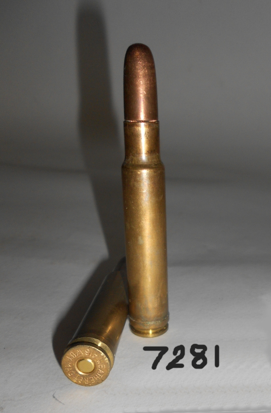 2 ROUNDS .416 WEATHERBY MAGNUM AMMUNITION, BASE MARKED 416 WBY MAG, ONE SOFT NOSE, ONE SOLID